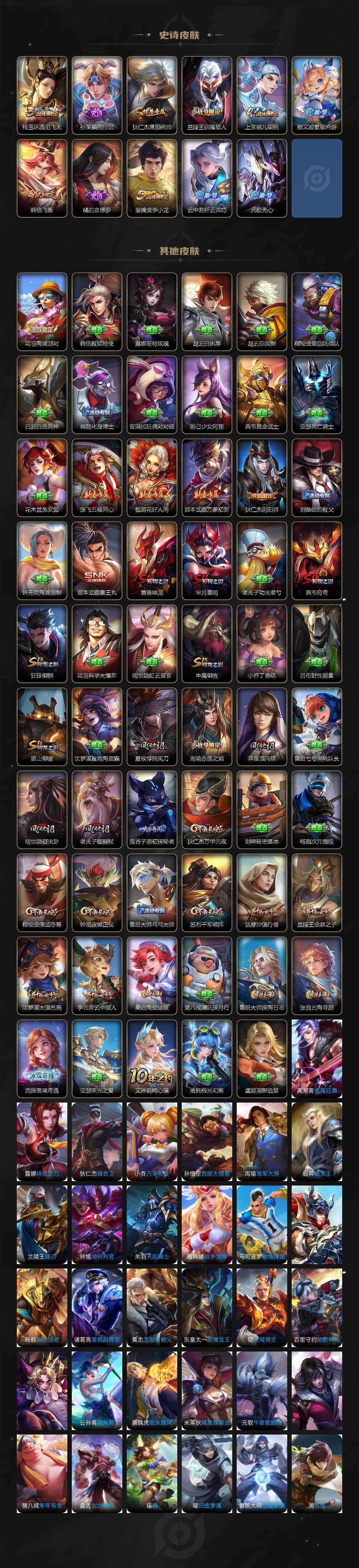 【限定皮肤】:狄仁杰阴阳师,赵云皇家上将,嬴政优雅恋人,芈月重明,周瑜赤莲之焰,元歌无心,夏侯惇朔风刀,曹操烛龙,典韦穷奇,狄仁杰魔术师,狄仁杰万华元夜,达摩沙漠行僧,项羽海滩派对,老夫子醍醐杖,程咬金