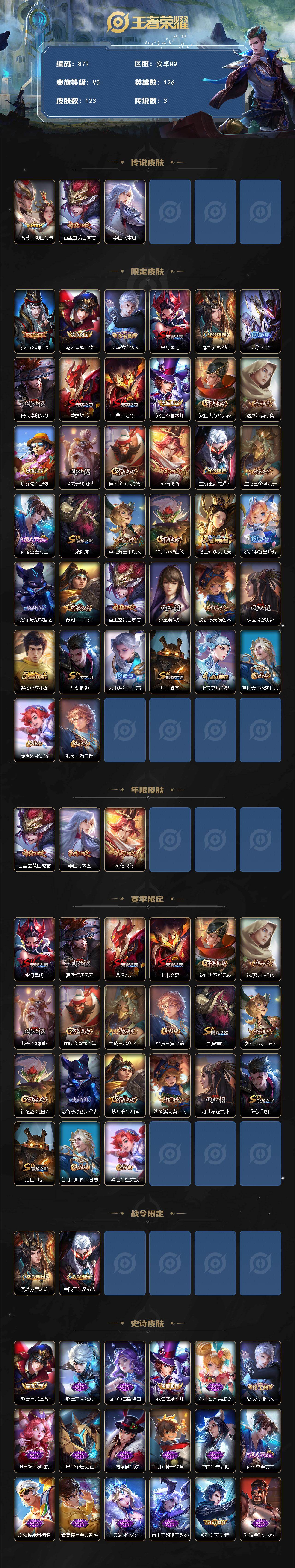997507 王者荣耀账号 安卓Q-V5-永恒钻石IV段位-126英雄-123皮肤-3传说-29史诗