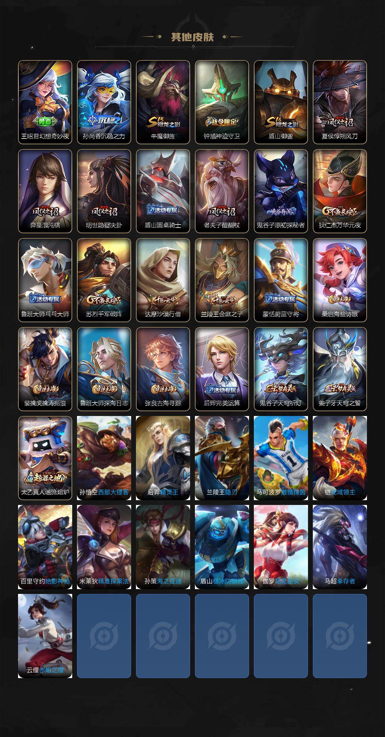 【限定皮肤】:姜子牙天穹之誓,狄仁杰阴阳师,赵云皇家上将,鲁班七号狮舞东方,夏侯惇朔风刀,狄仁杰魔术师,狄仁杰万华元夜,达摩沙漠行僧,项羽海滩派对,老夫子醍醐杖,兰陵王金庭之子,孙悟空大圣娶亲,牛魔御旌,钟馗