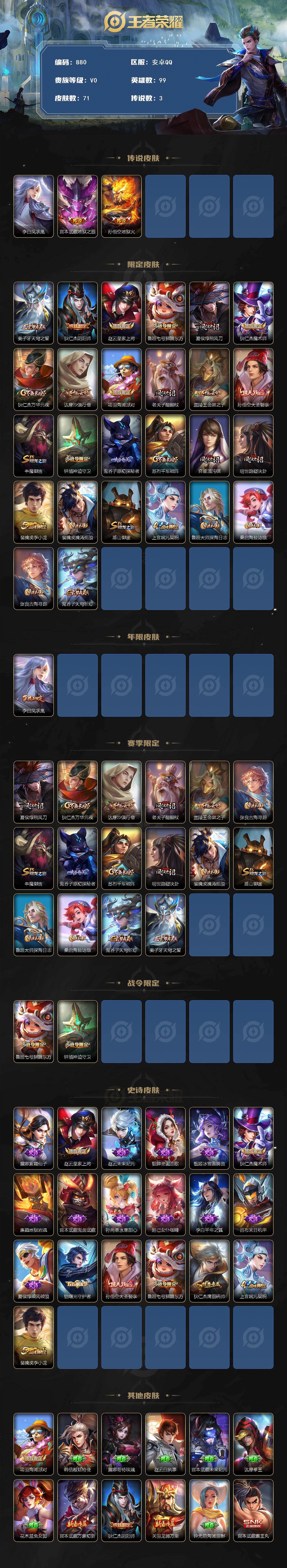 1997515 王者荣耀账号 安卓Q-V0-荣耀黄金III段位-99英雄-71皮肤-3传说-19史诗