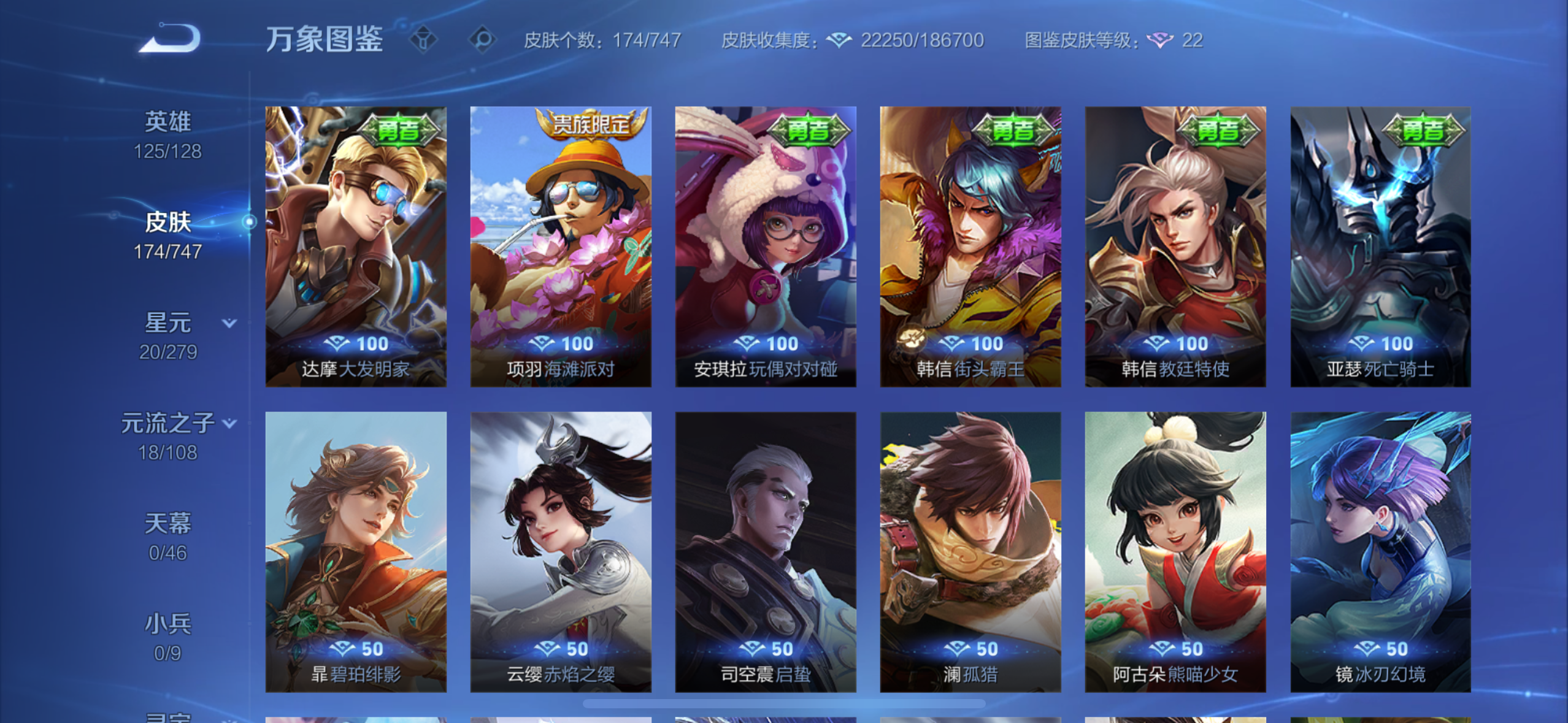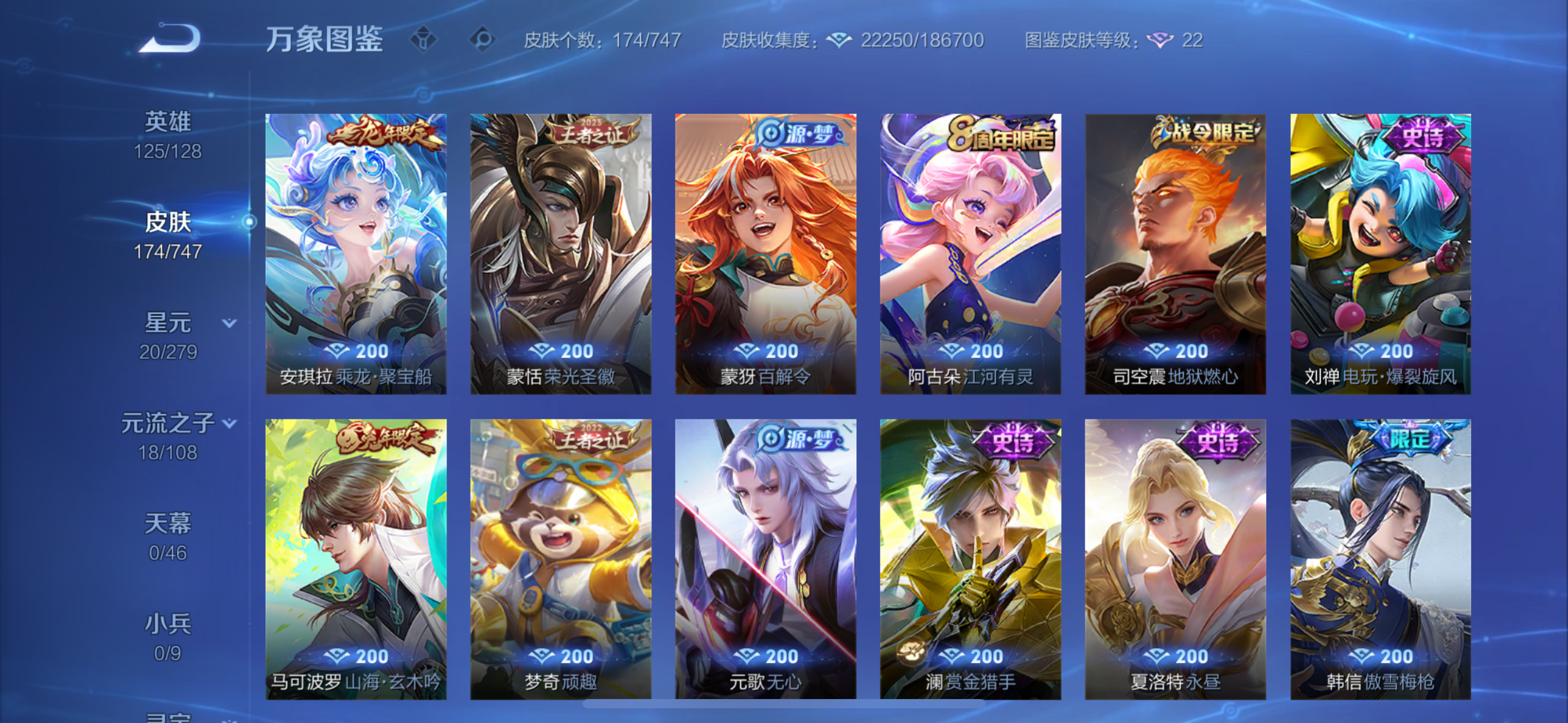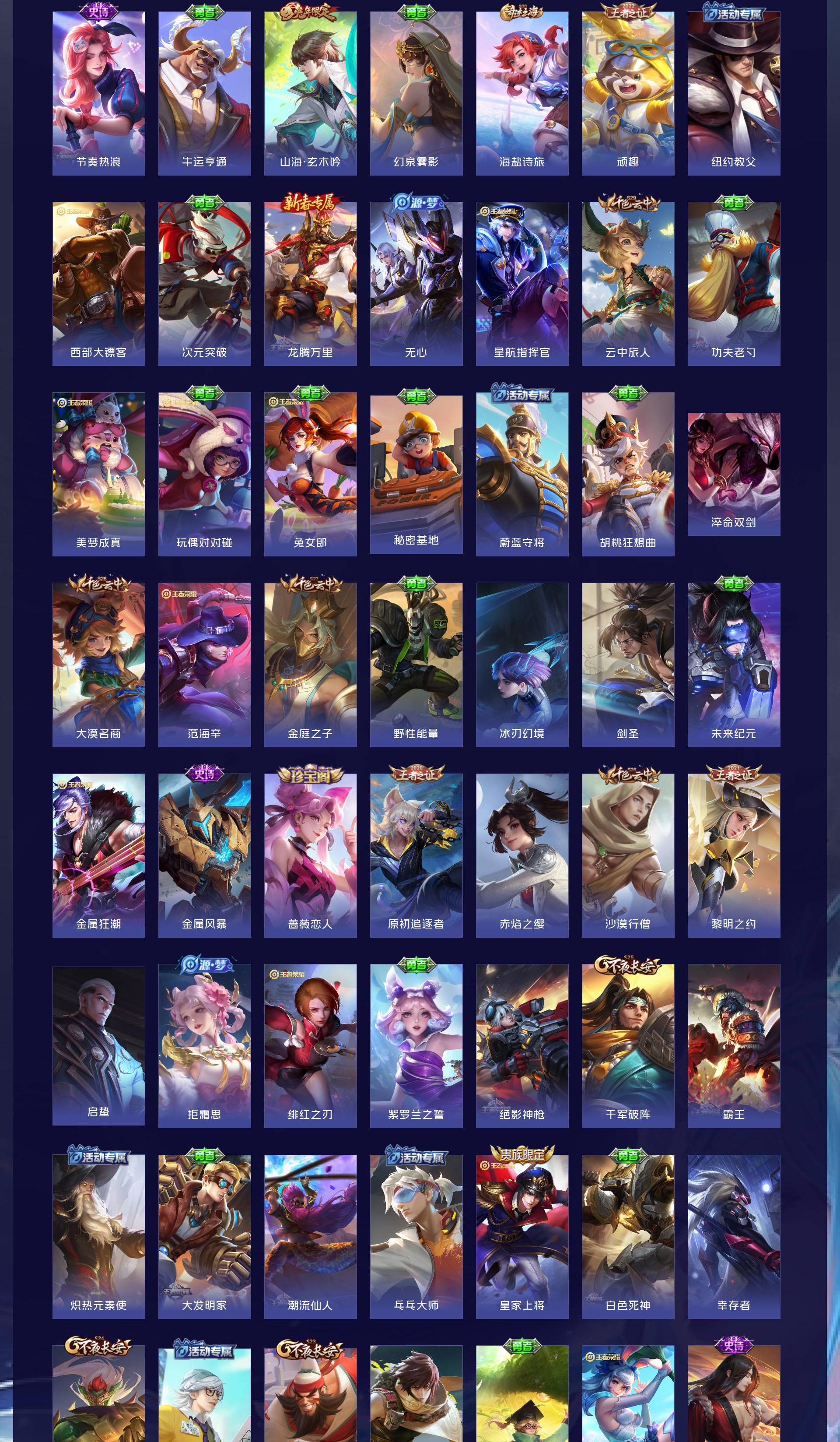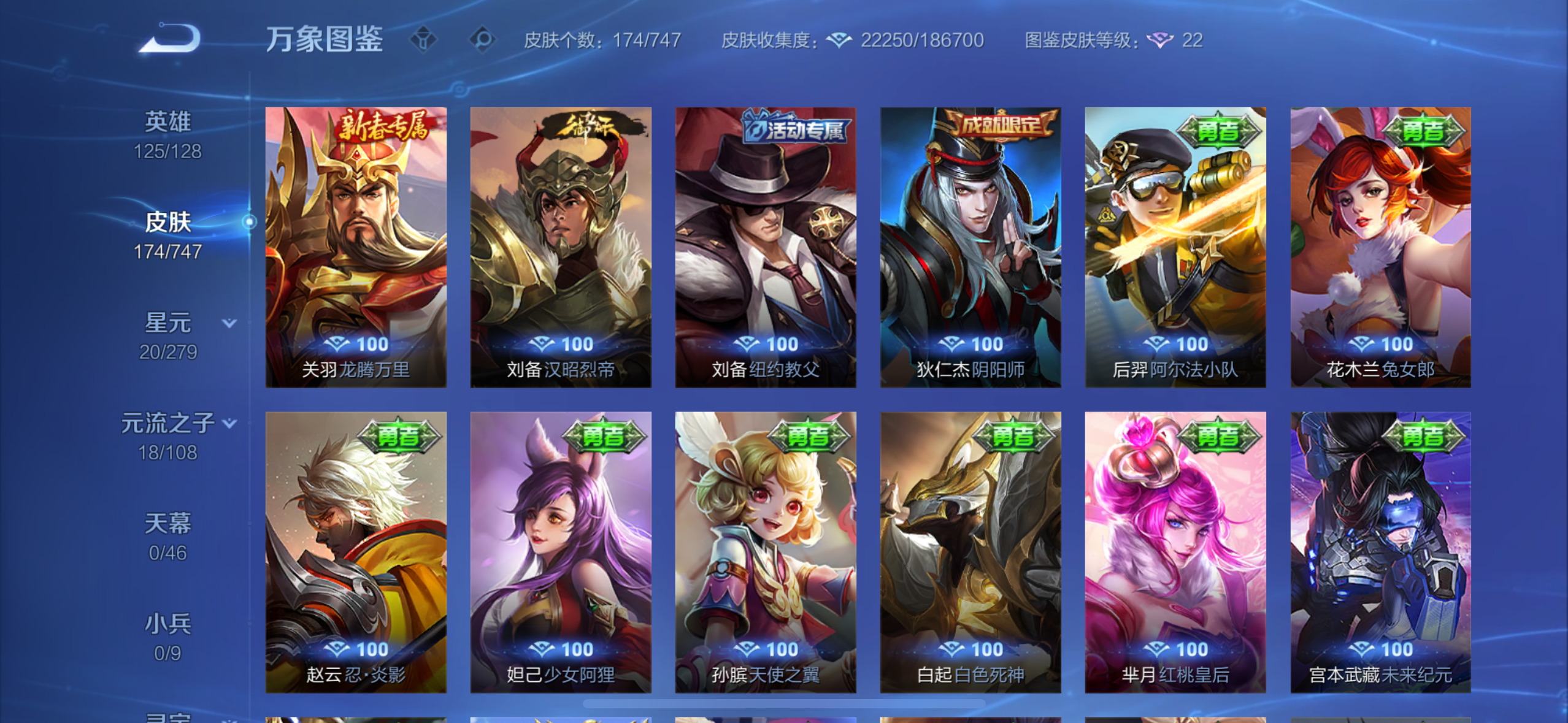 英雄多,皮肤174个,传说限定都有