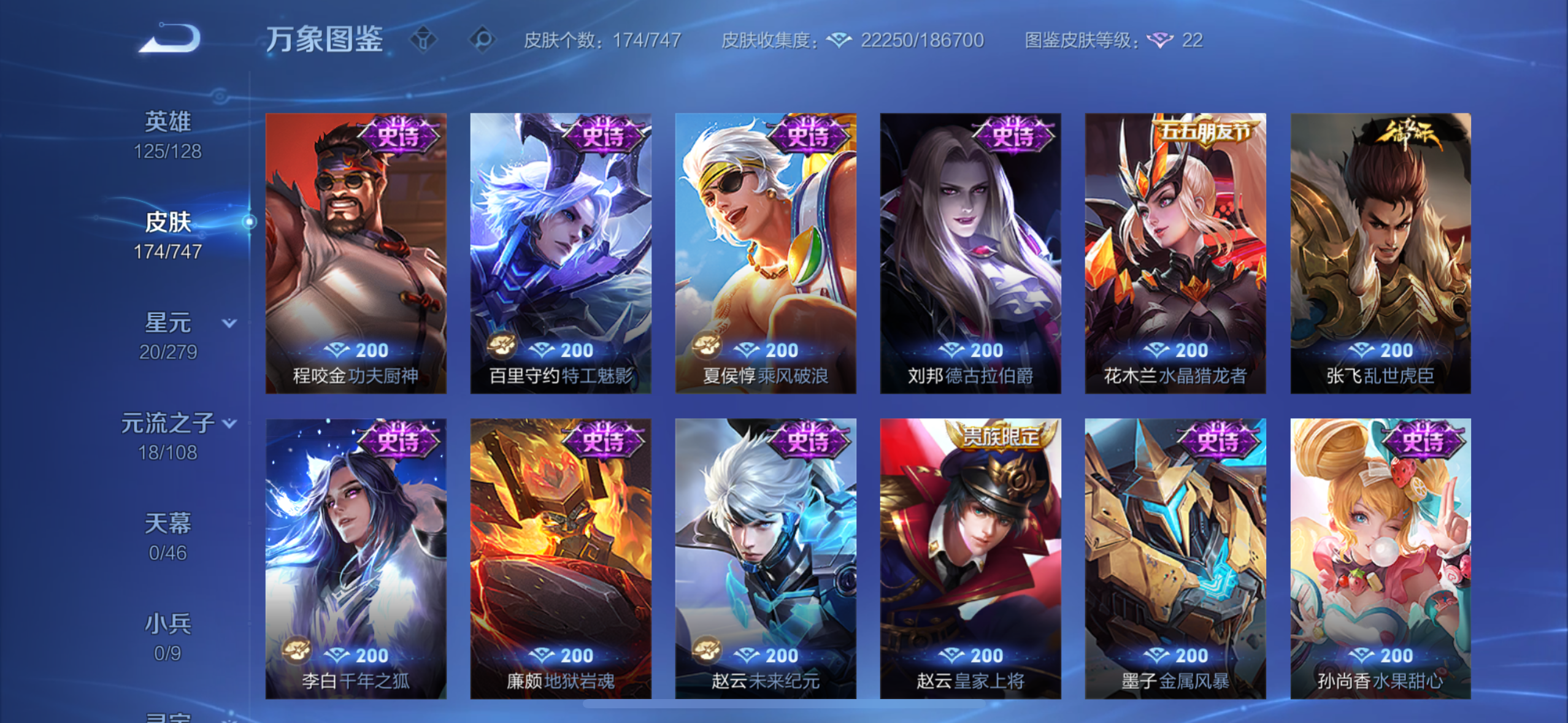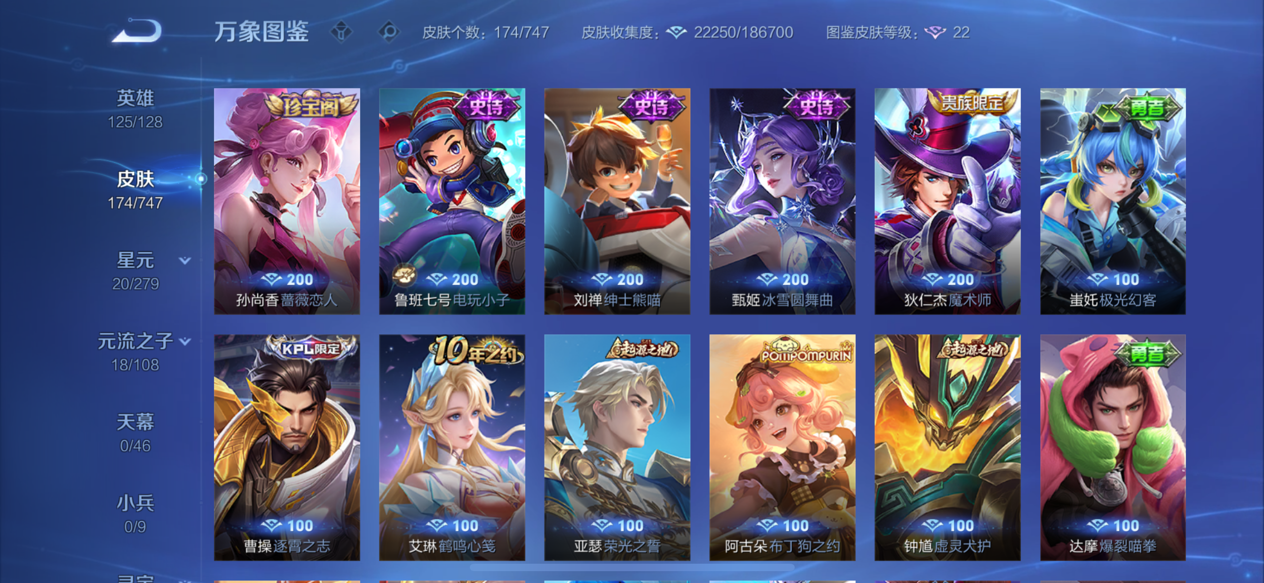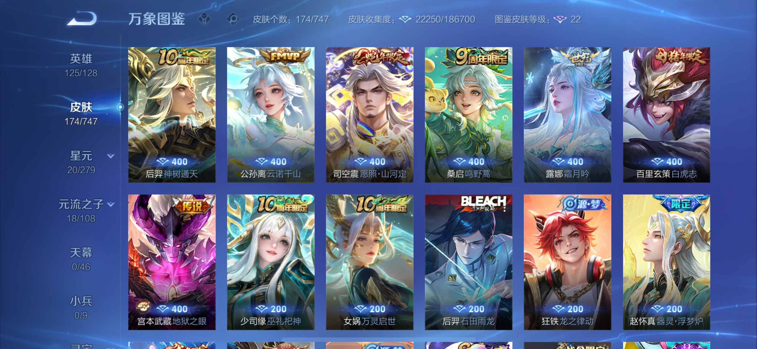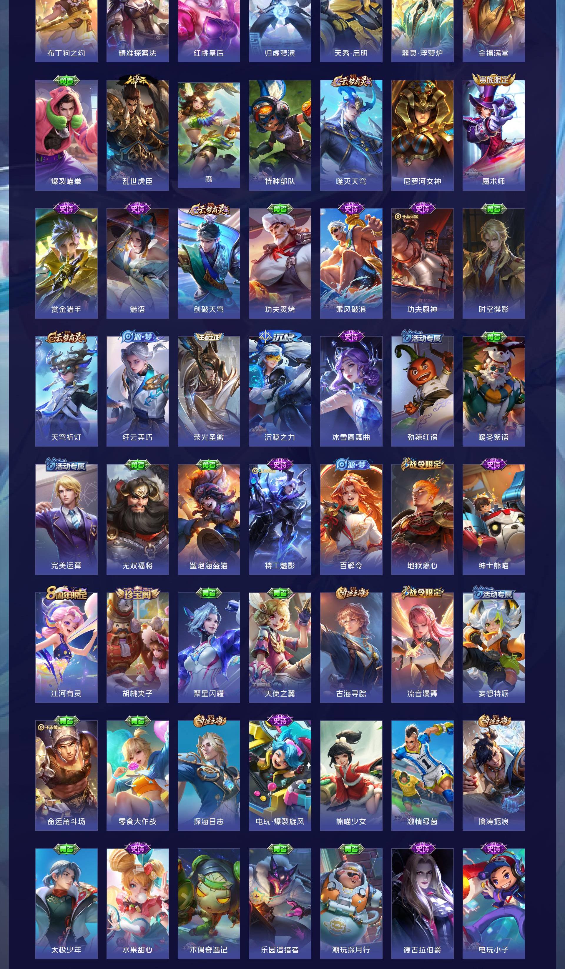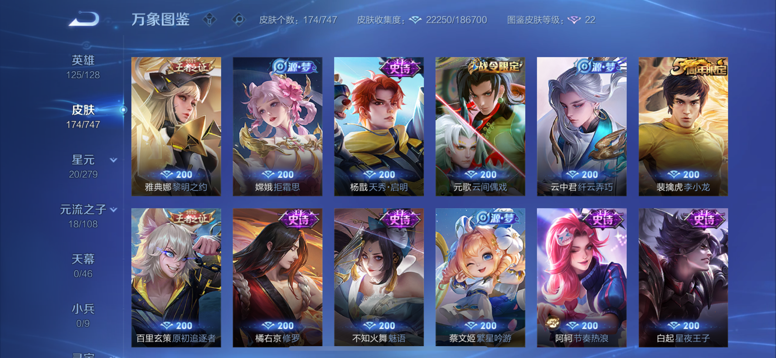 英雄多,皮肤174个,传说限定都有