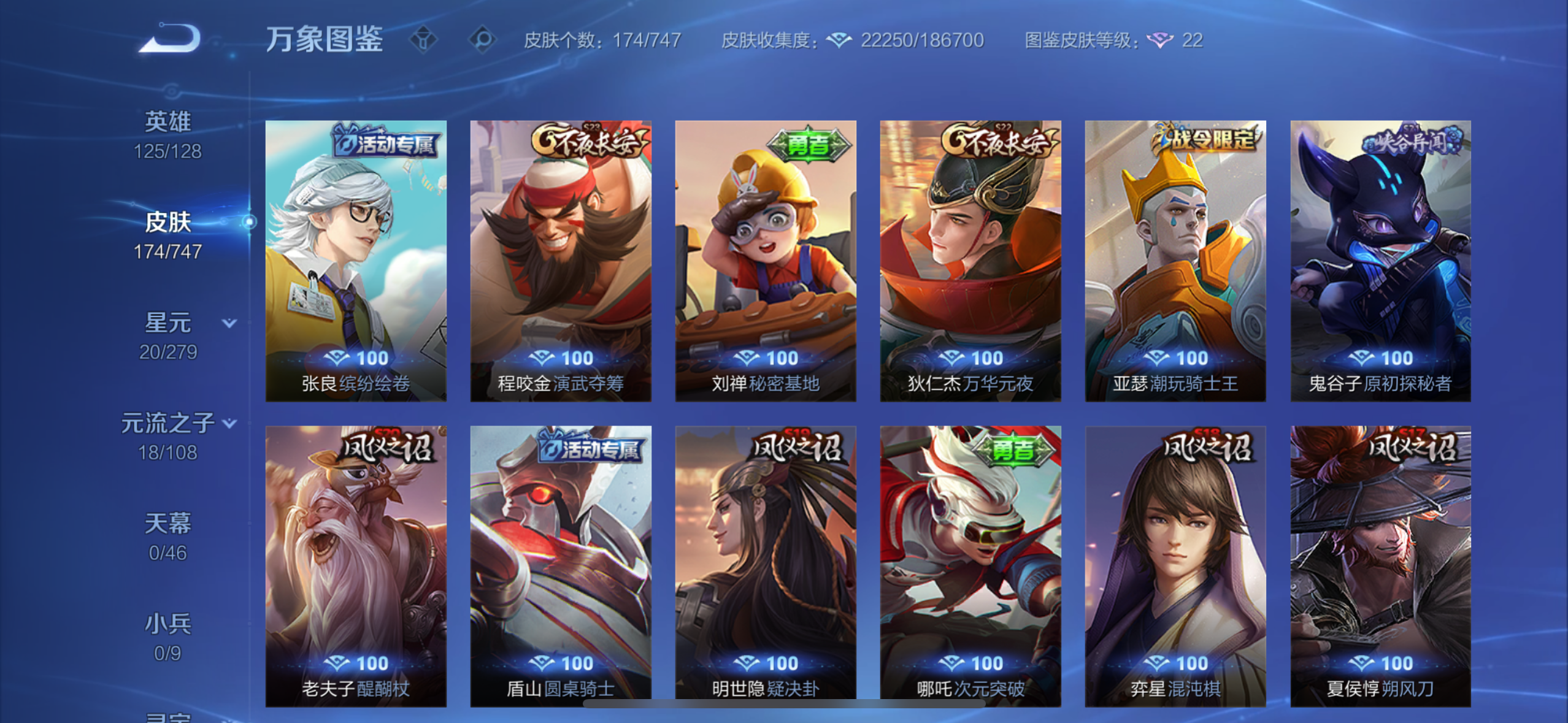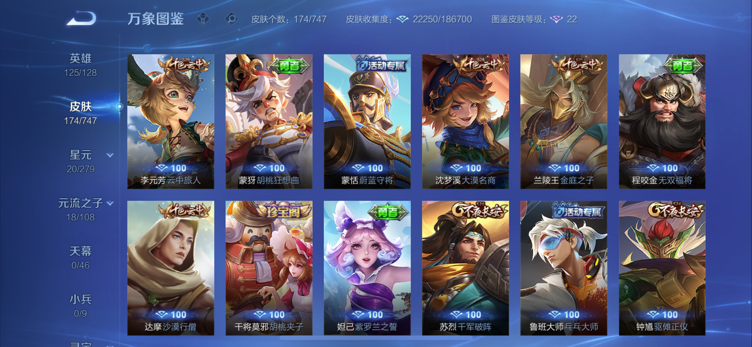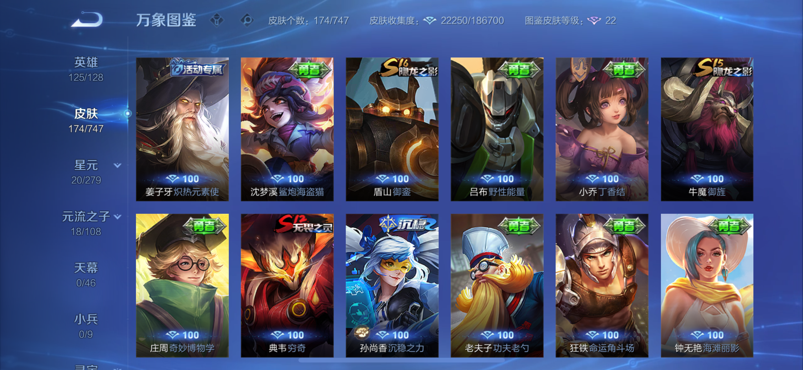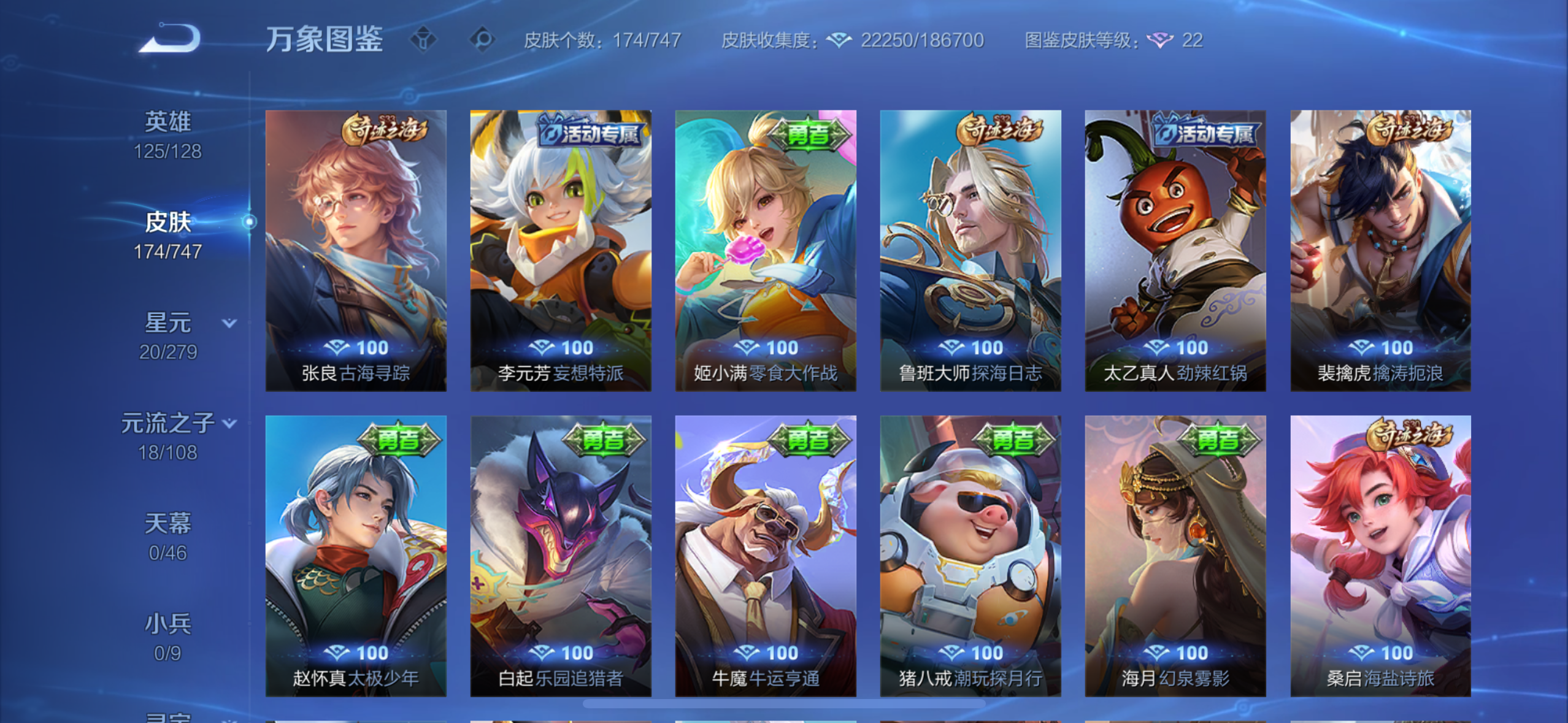 英雄多,皮肤174个,传说限定都有