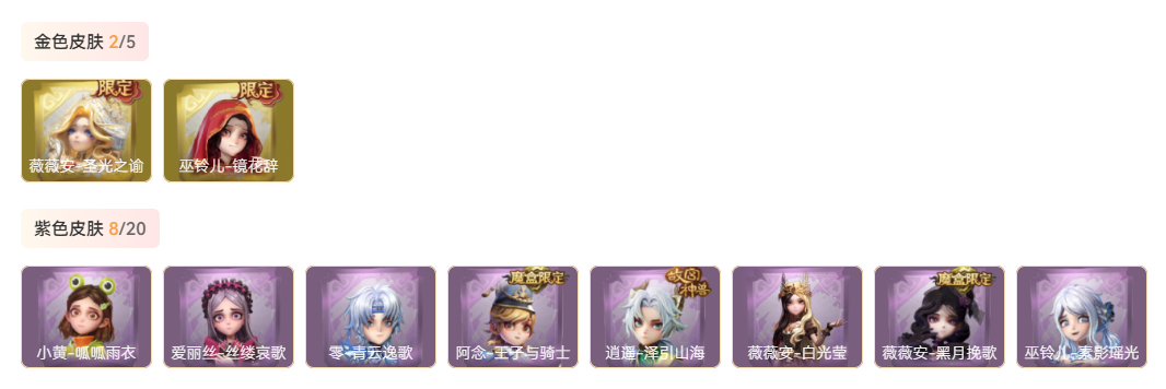 2金8紫?镜花辞?圣光之谕?白光莹?泽引山海?青云逸歌?素影瑶光?黑风挽歌?永眠曲?金丝眼镜?凤鸣九