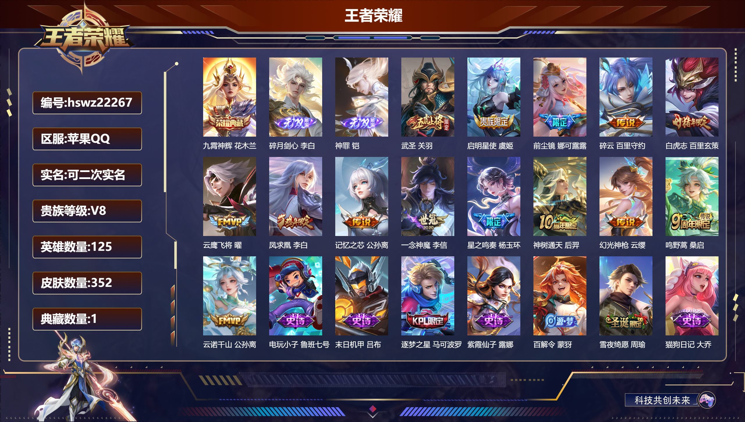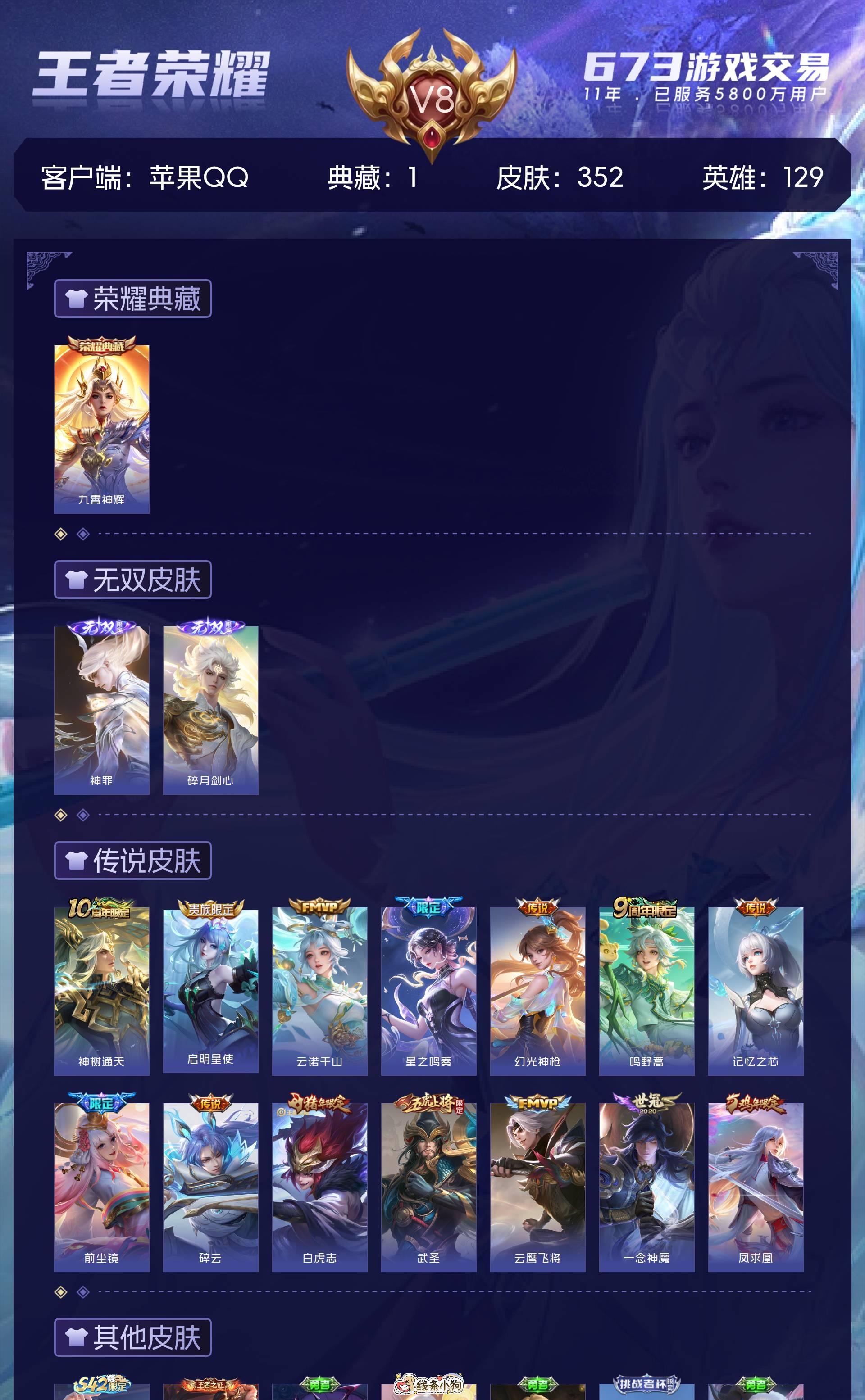 苹果QQ/永恒钻石/352皮肤/125英雄/1典藏/0珍品无双/2无双/0珍品传说/14传说/88史