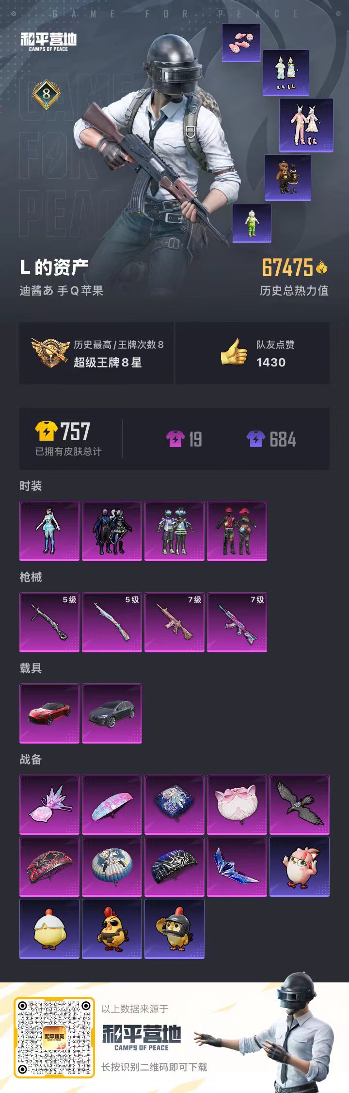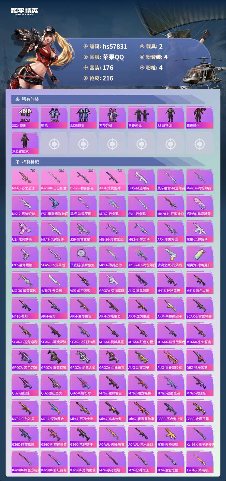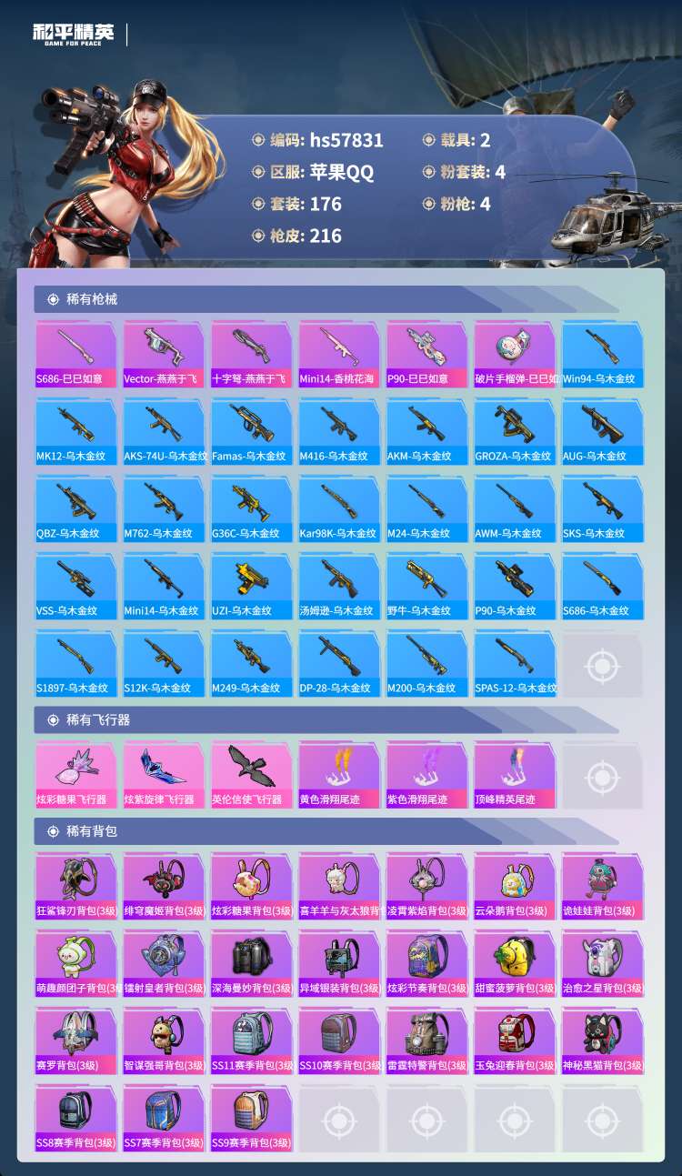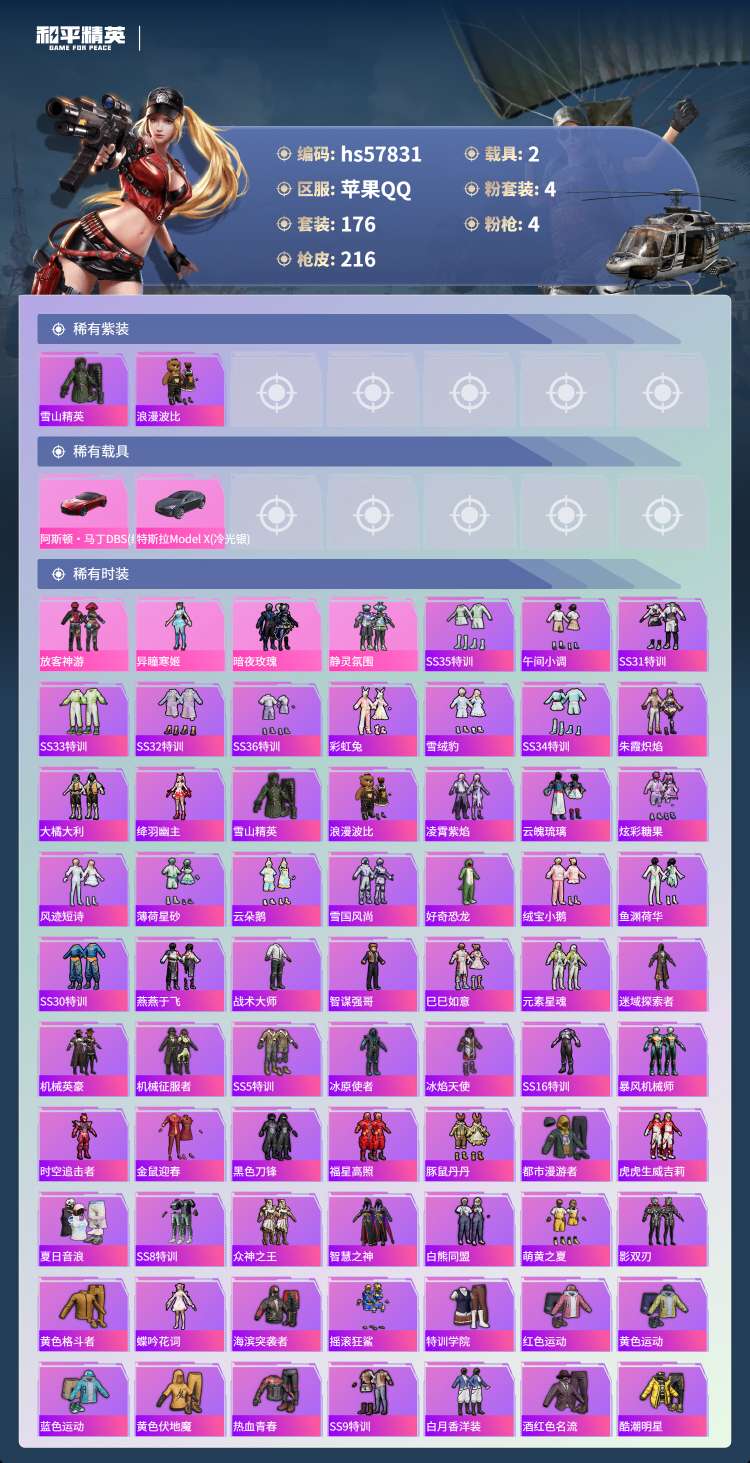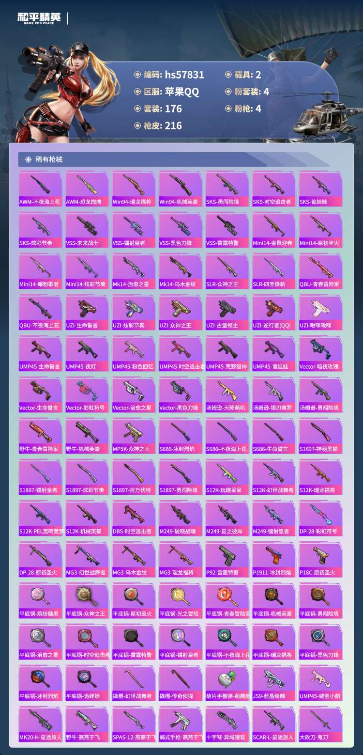 hs57831 苹果手Q-8王牌印记-4粉装-4特效枪-2载具-67475热力值-176套装-216