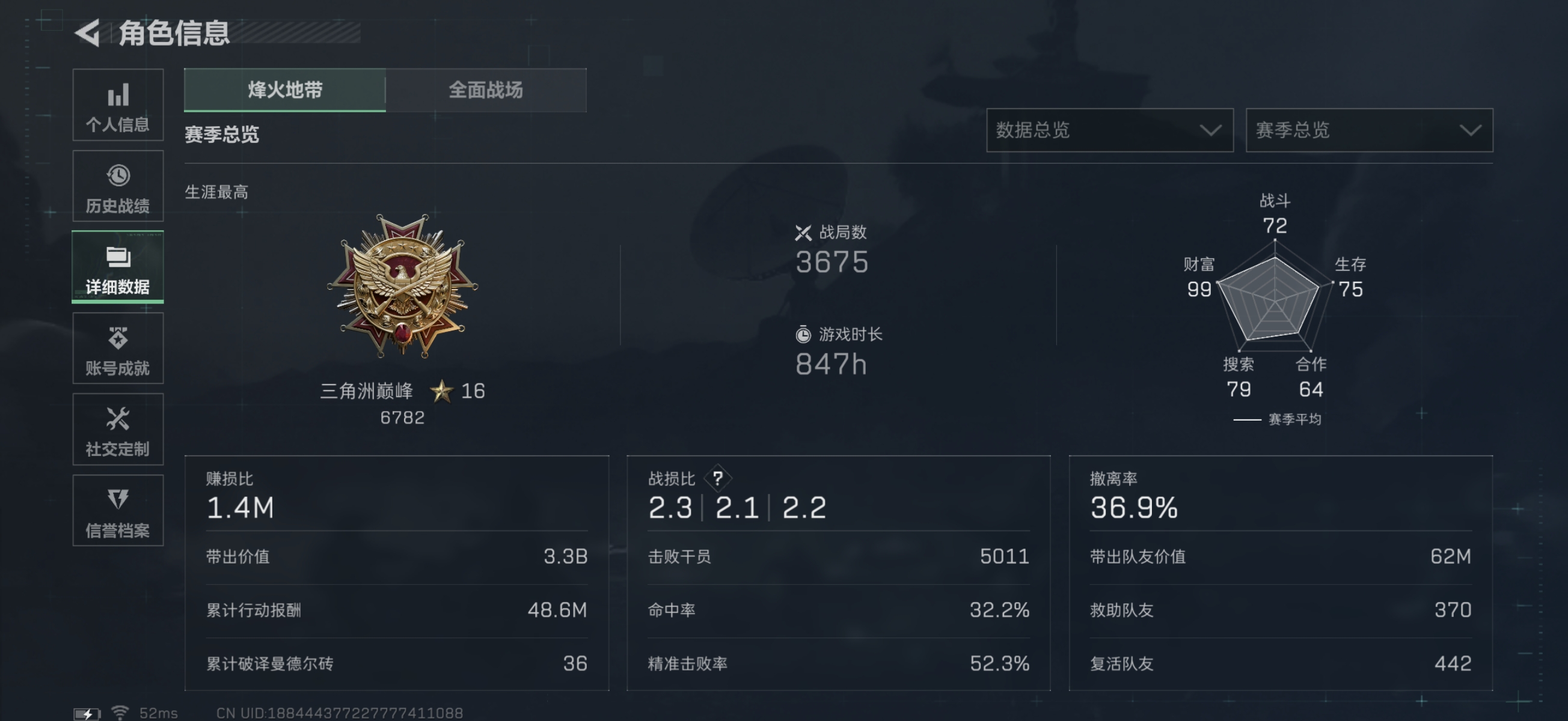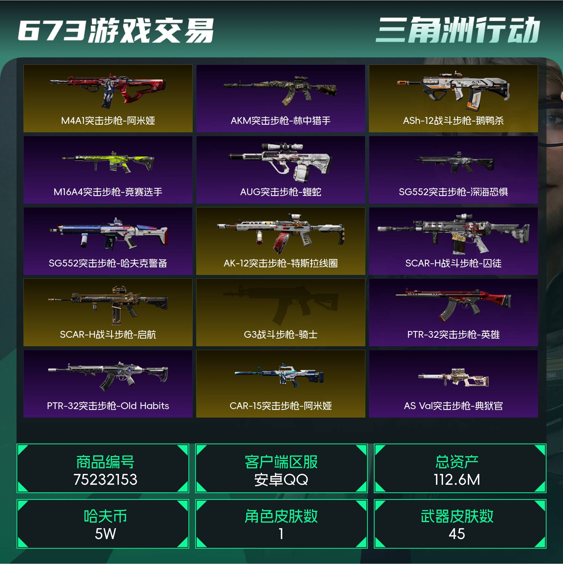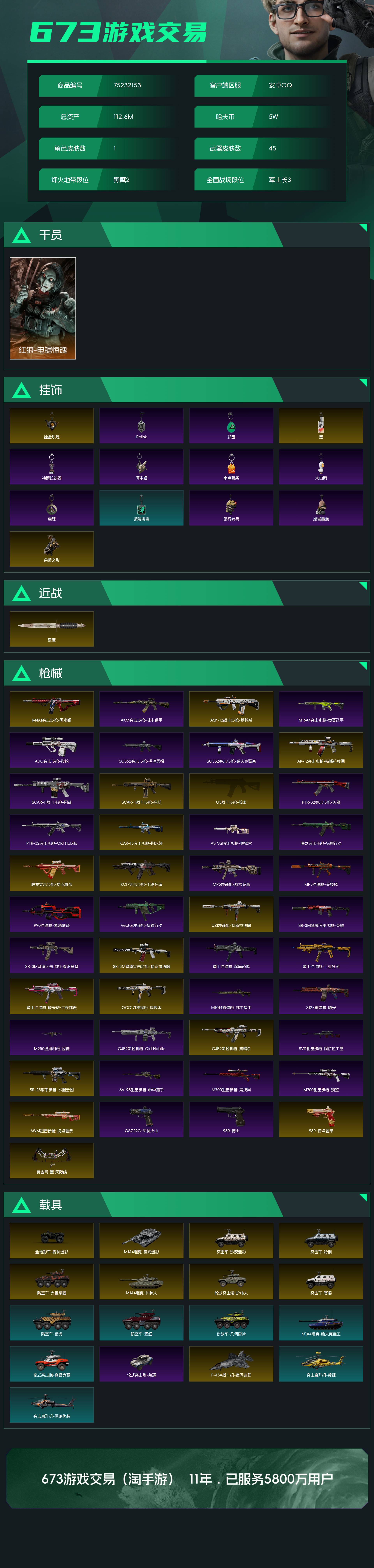 烽火段位黑鹰2 战场段位军士长3 总资产112.6M 哈夫币5W 干员1 挂饰13 近战1 枪械45