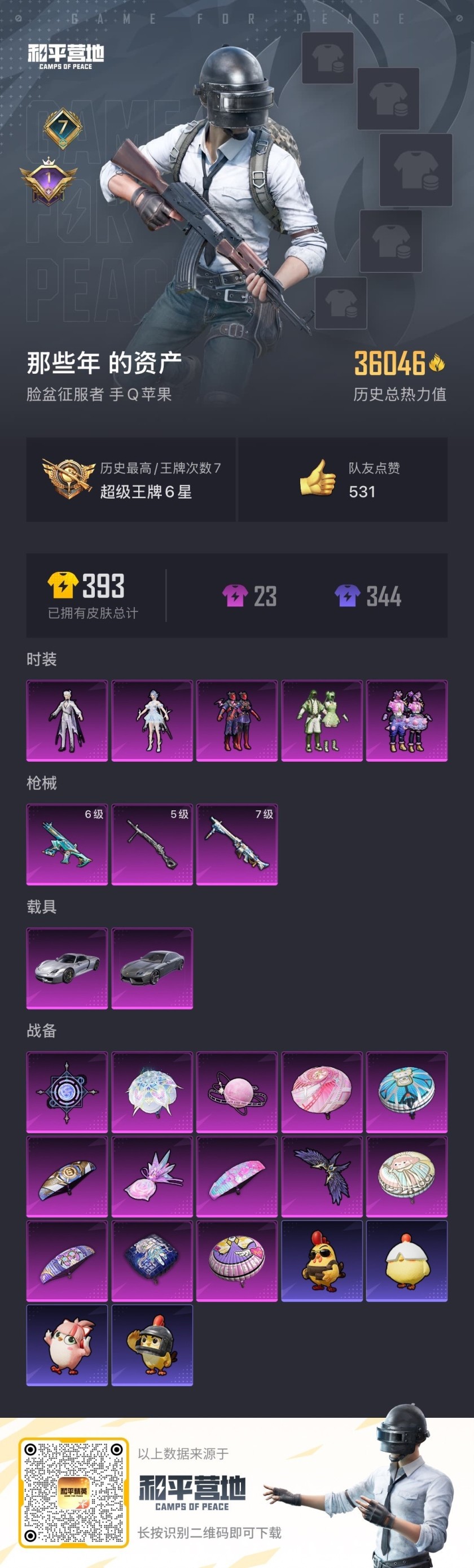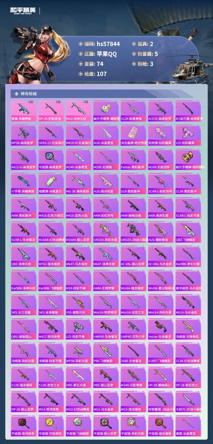 hs57844 苹果手Q-7王牌印记-5粉装-3特效枪-2载具-36046热力值-74套装-107枪