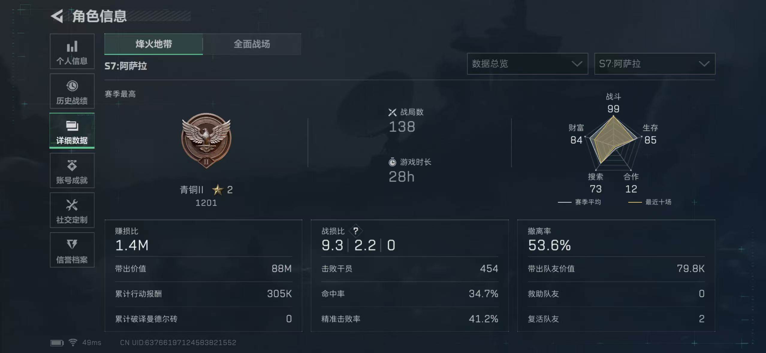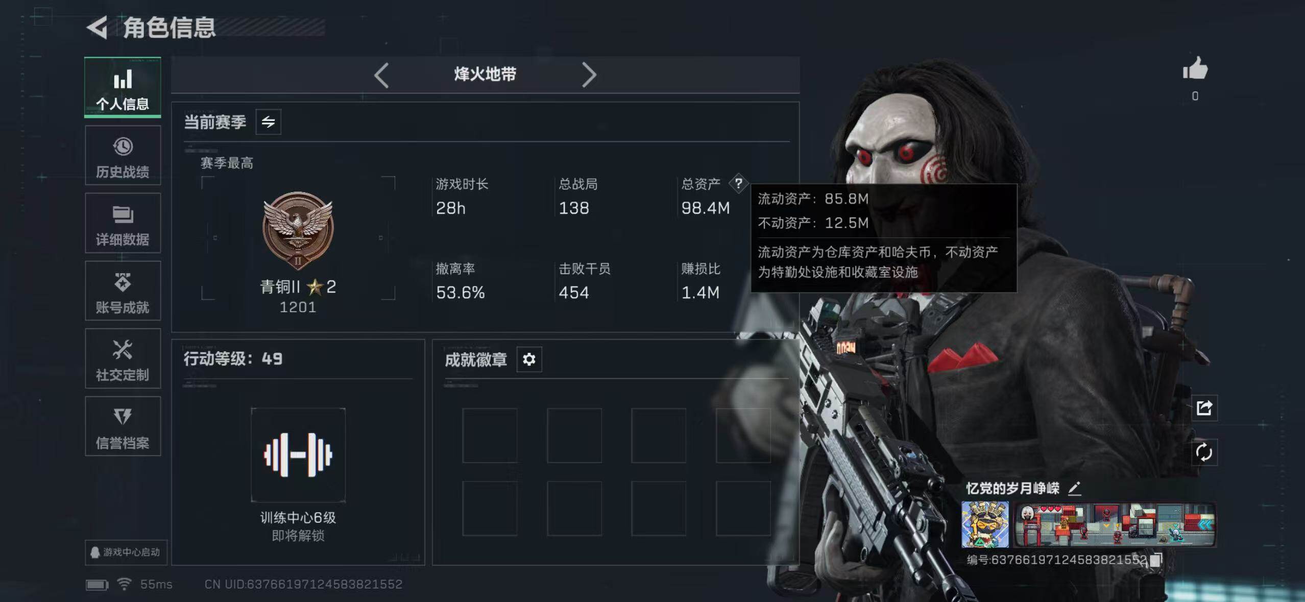 【SJ898】98m总资产-59709k哈伏币-49烽火等级-青铜-1战场等级-无军衔