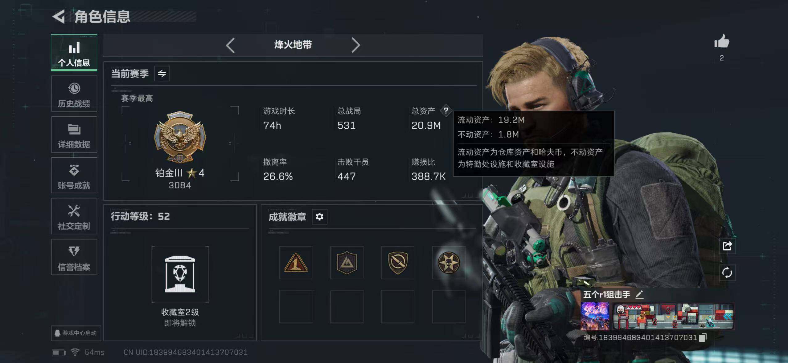 21m总资产-912k哈伏币-52烽火等级-铂金-1战场等级