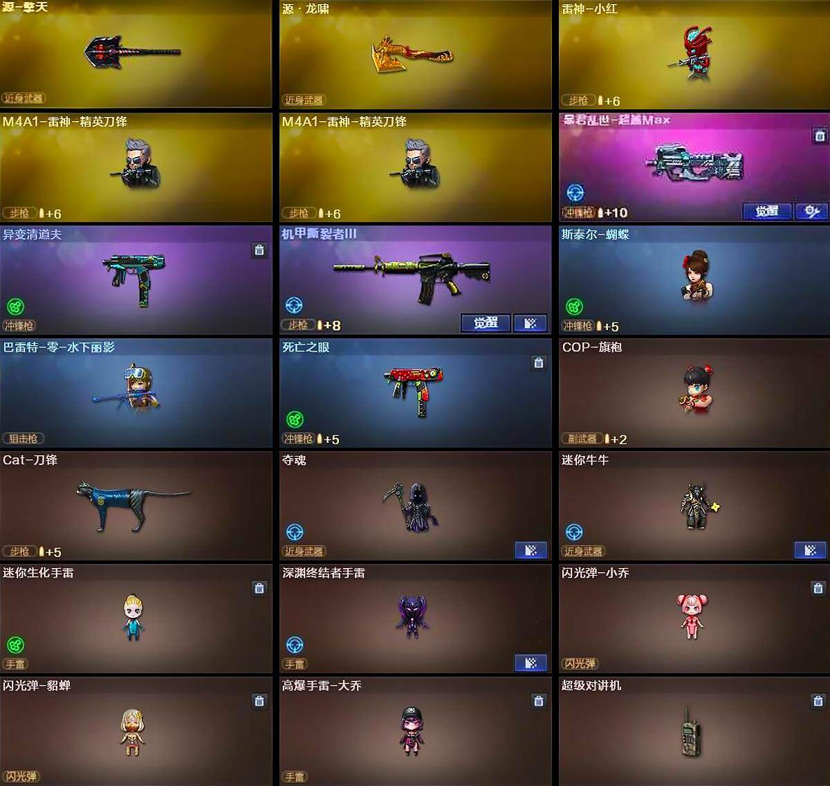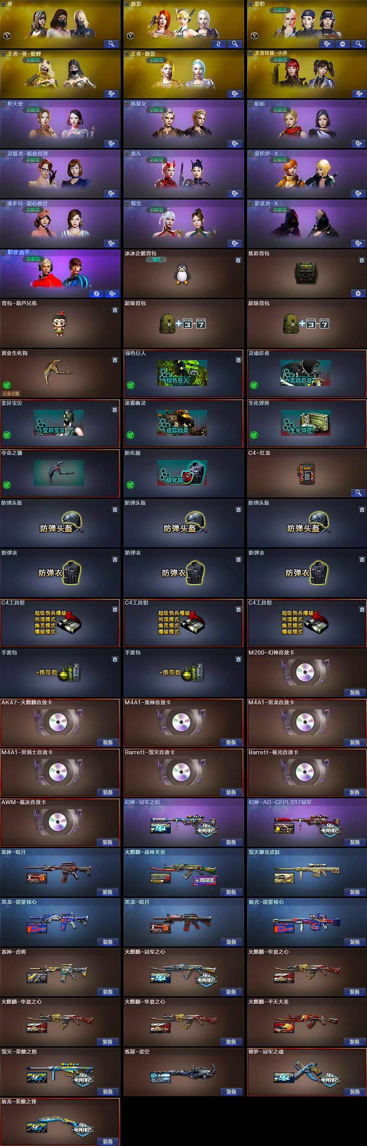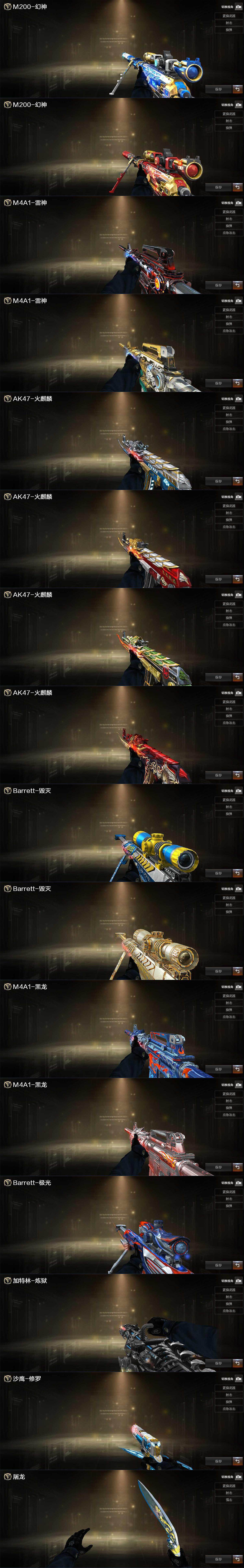 【热门武器】:QBZ03-金色蔷薇,M200-幻神*2,死亡之眼,荣耀世冠-火麒麟,荣耀世冠-雷神,荣耀世冠-柯尔特,Kar98K-星神,金色小号,Cat-刀锋,M4A1-黑骑士*4,汤姆逊-烈龙*6,RPK-盘龙*6,加特林-炼狱*7,斯泰尔-蝴蝶,雷神-小红,USP-雷暴,COP-堕天神,COP 357-幻灵,沙鹰-修罗*5,荣耀世冠-龙啸,金刚伞