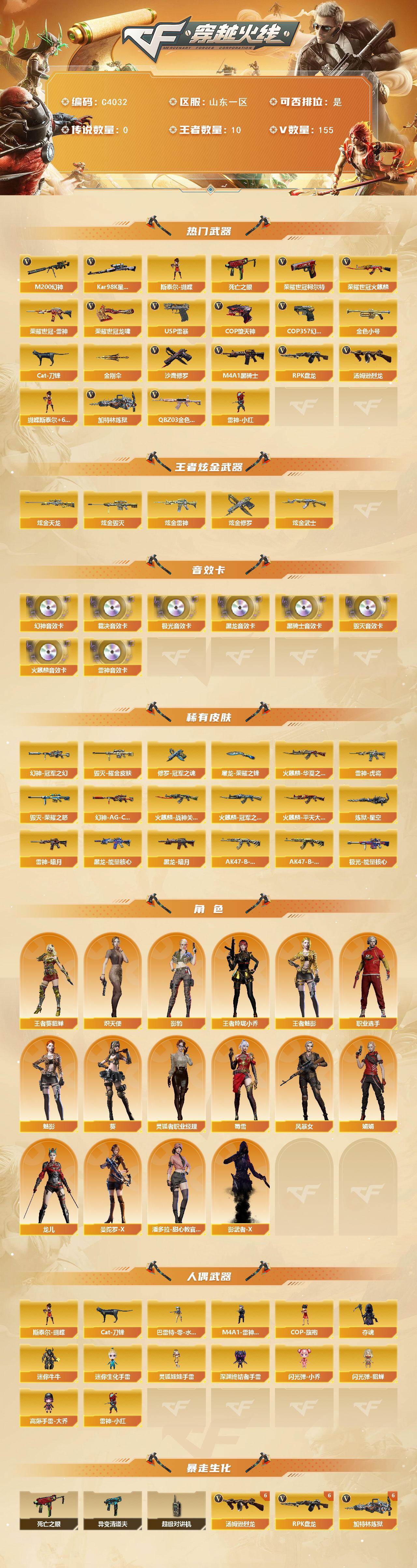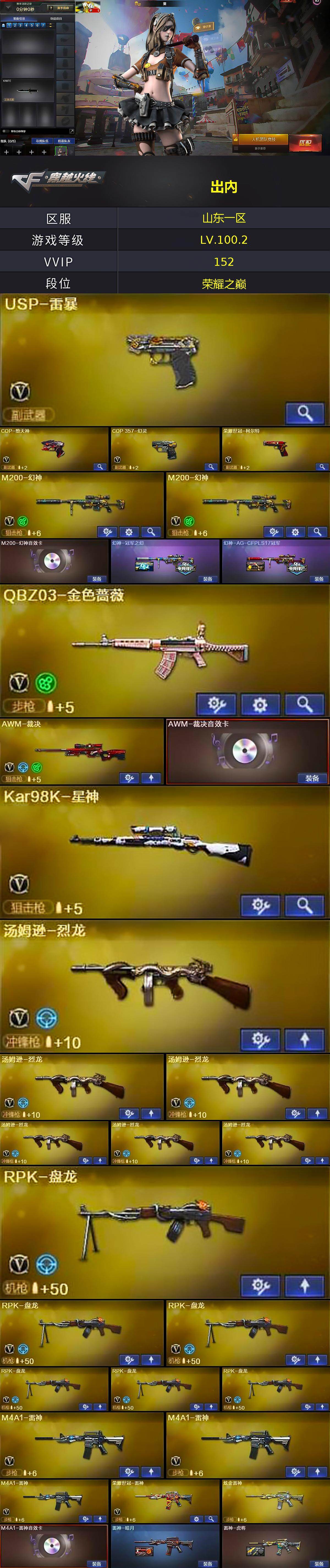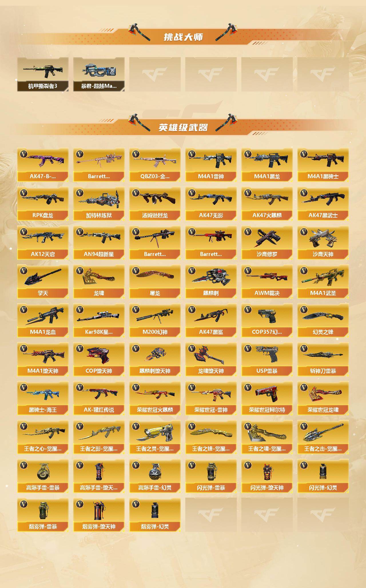 【热门武器】:QBZ03-金色蔷薇,M200-幻神*2,死亡之眼,荣耀世冠-火麒麟,荣耀世冠-雷神,荣耀世冠-柯尔特,Kar98K-星神,金色小号,Cat-刀锋,M4A1-黑骑士*4,汤姆逊-烈龙*6,RPK-盘龙*6,加特林-炼狱*7,斯泰尔-蝴蝶,雷神-小红,USP-雷暴,COP-堕天神,COP 357-幻灵,沙鹰-修罗*5,荣耀世冠-龙啸,金刚伞