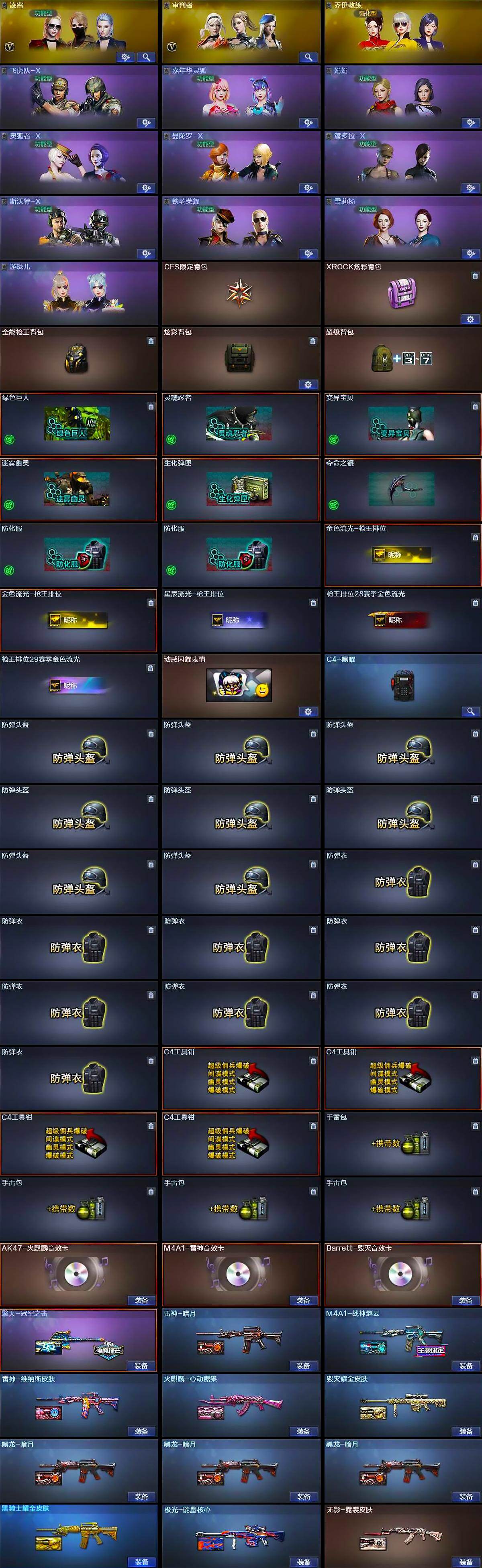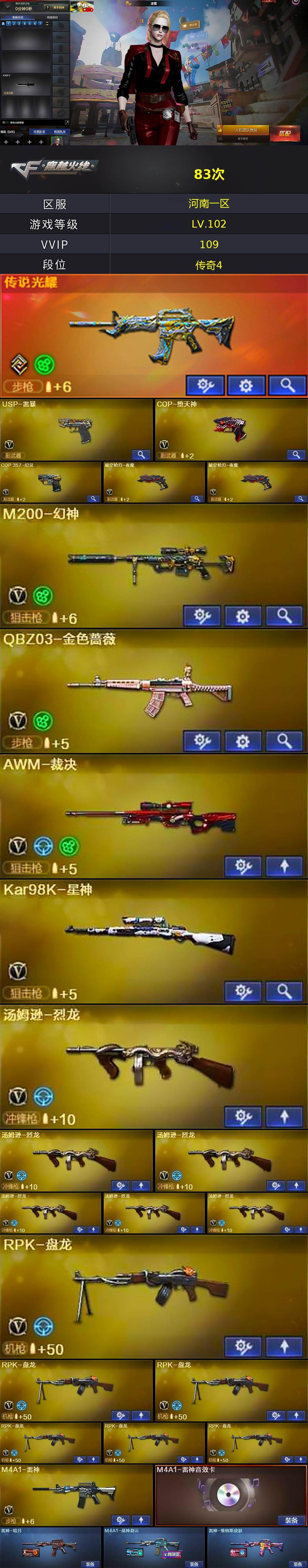 【热门武器】:传说光耀,QBZ03-金色蔷薇,HK417-朱雀,M4A1-青龙,M200-幻神,Kar98K-星神,牛牛-AK47,M4A1-黑骑士*2,汤姆逊-烈龙*6,RPK-盘龙*6,加特林-炼狱,斯泰尔-蝴蝶,雷神-小红,USP-雷暴,COP-堕天神,COP 357-幻灵,沙鹰-修罗*3,金刚伞