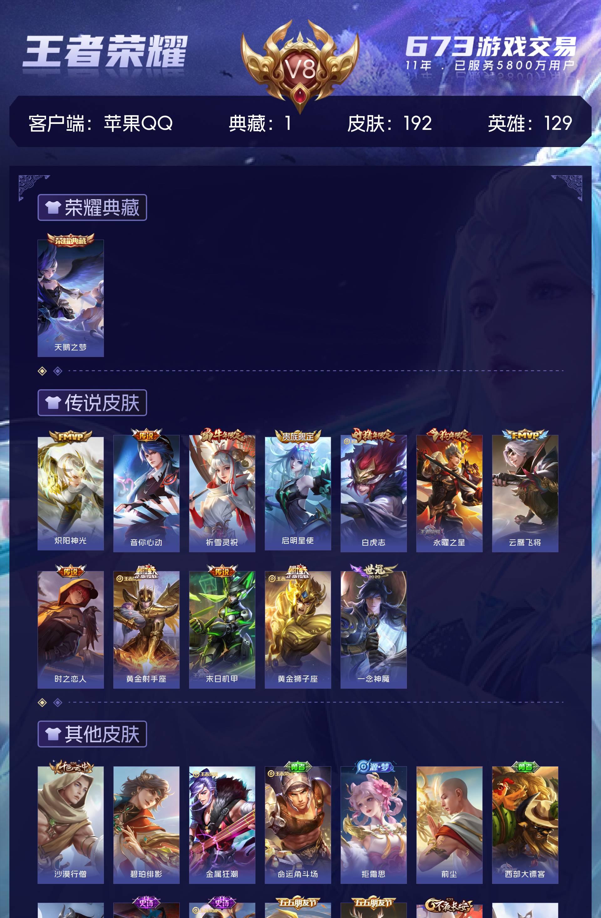 V8 皮肤192 英雄129 荣耀黄金 荣耀典藏1 传说12 其他皮肤185