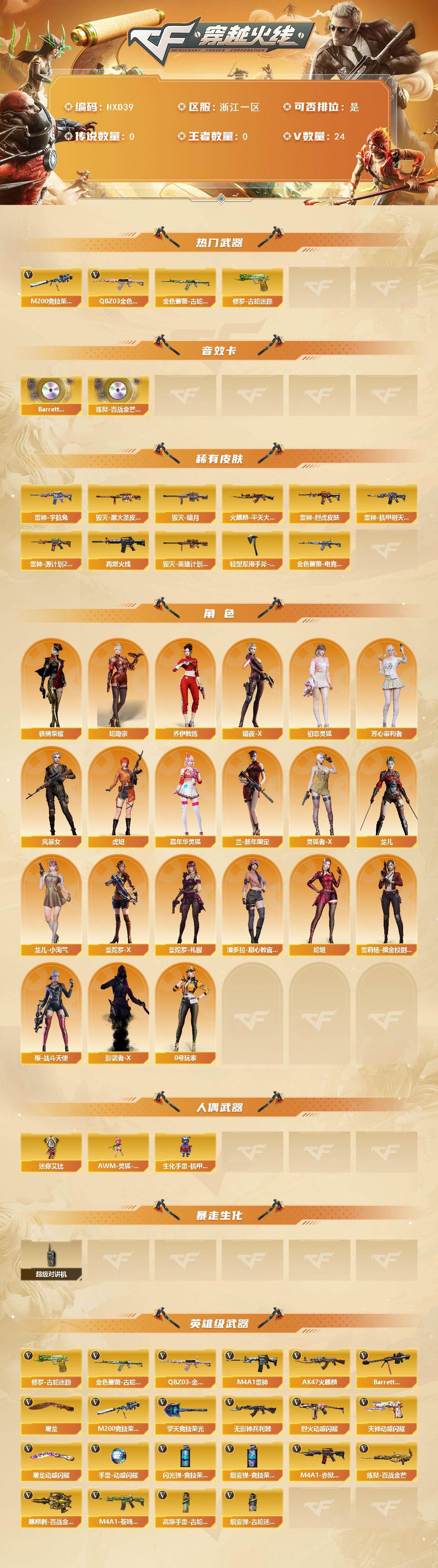 【HXD39】22V/102级/荣耀元首/2英雄/QBZ03-金色蔷薇/金色蔷薇-古蛇迷踪/修罗-古蛇迷踪/M200_竞技荣光/Barrett-碧霄极光音效卡/炼狱-百战金芒-庆典舞曲音效卡/金色蔷薇-电竞之星 皮肤/雷神-烈虎皮肤/雷神-机甲刑天皮肤/雷神-宇航兔皮肤/雷神-源计划2.0专属 皮肤/M4A1-再燃火线/火麒麟-平天大圣/毁灭-暗月/毁灭-黑大圣皮肤/毁灭-英雄计划 皮肤/轻型军用手斧-再燃火线/蛇隐宗/乔伊教练/暗夜-X/初恋灵狐/芳心审判者/风暴女/虎妞/嘉年华灵狐/兰-新年