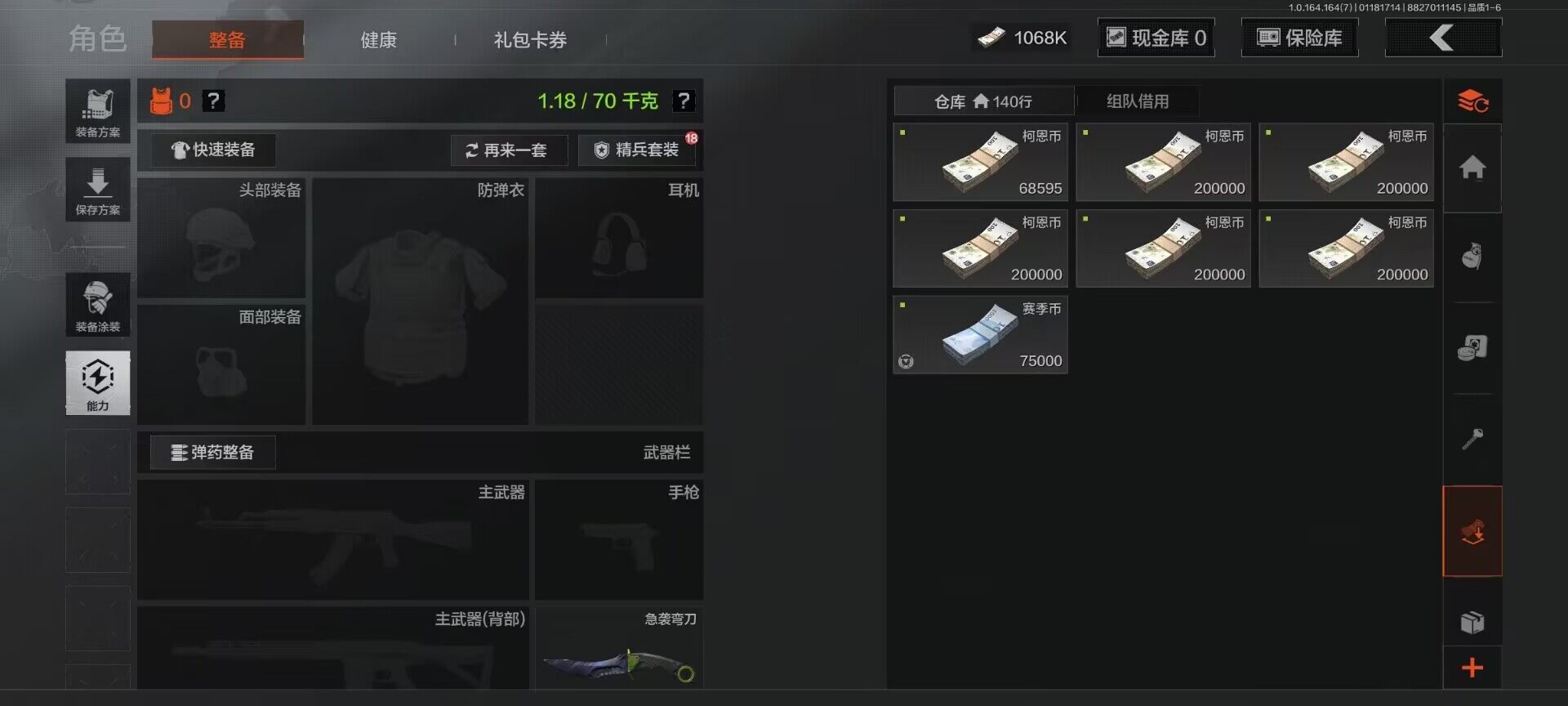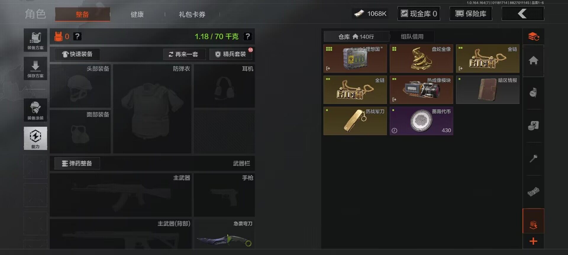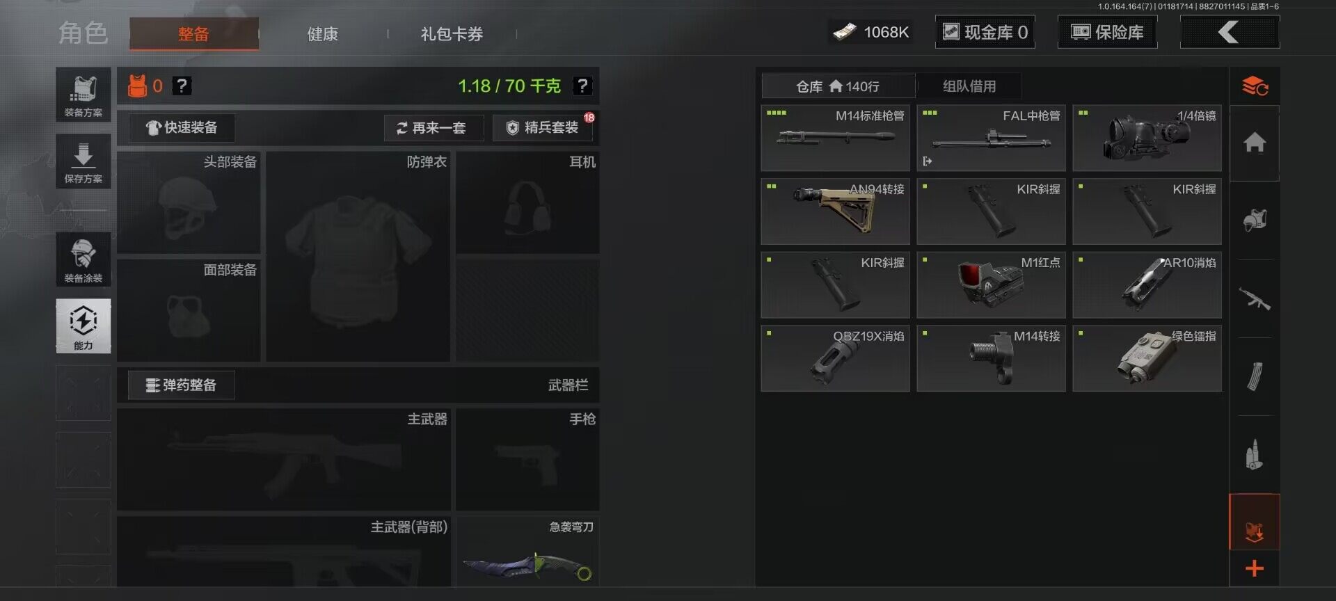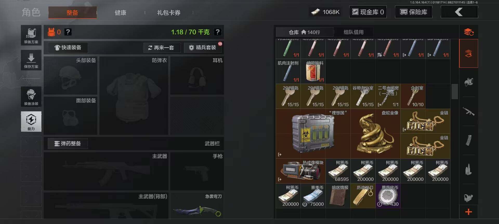 仓库价值(百万):6.1/柯恩币:1068000/工兵铲/急袭弯刀