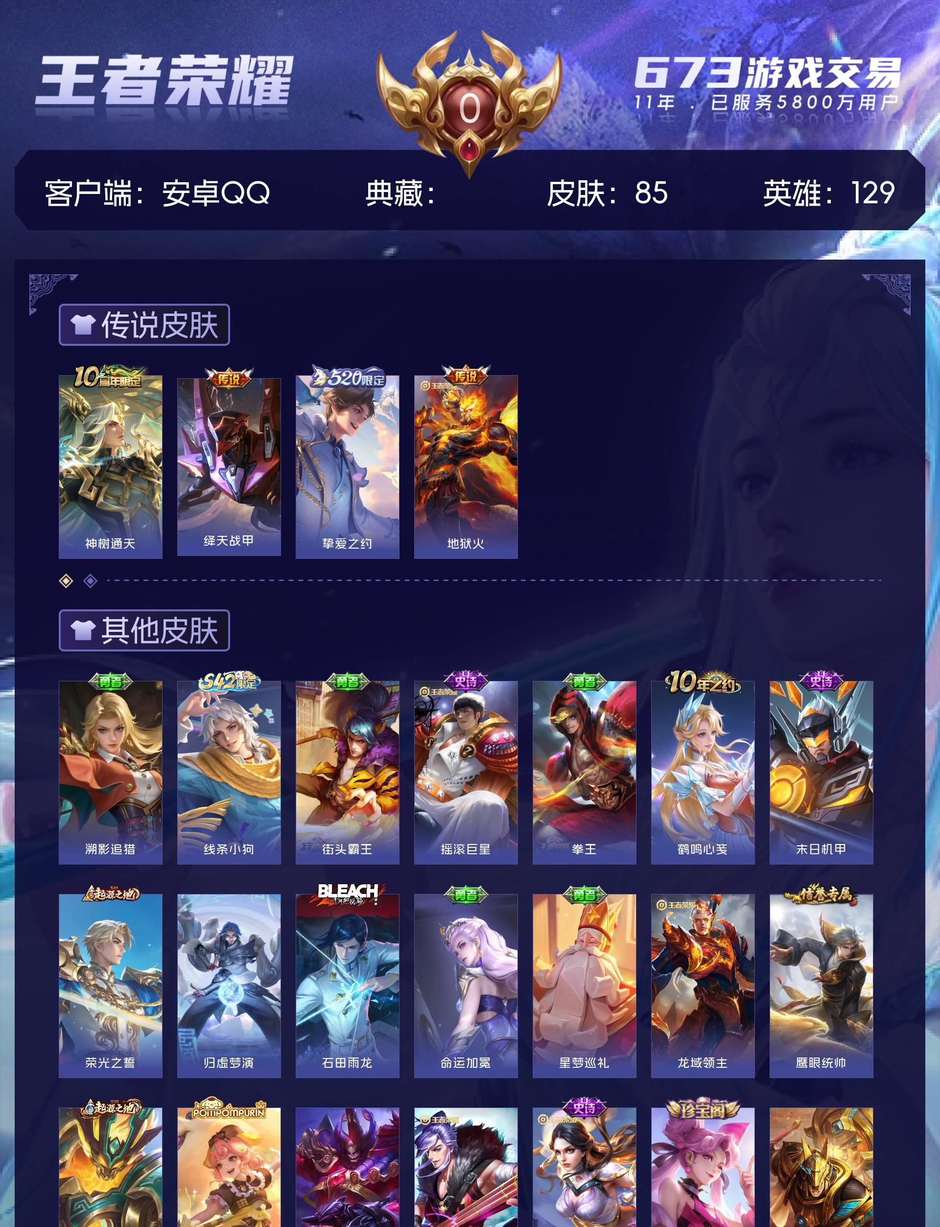 皮肤85 英雄129 尊贵铂金 传说4 其他皮肤87
