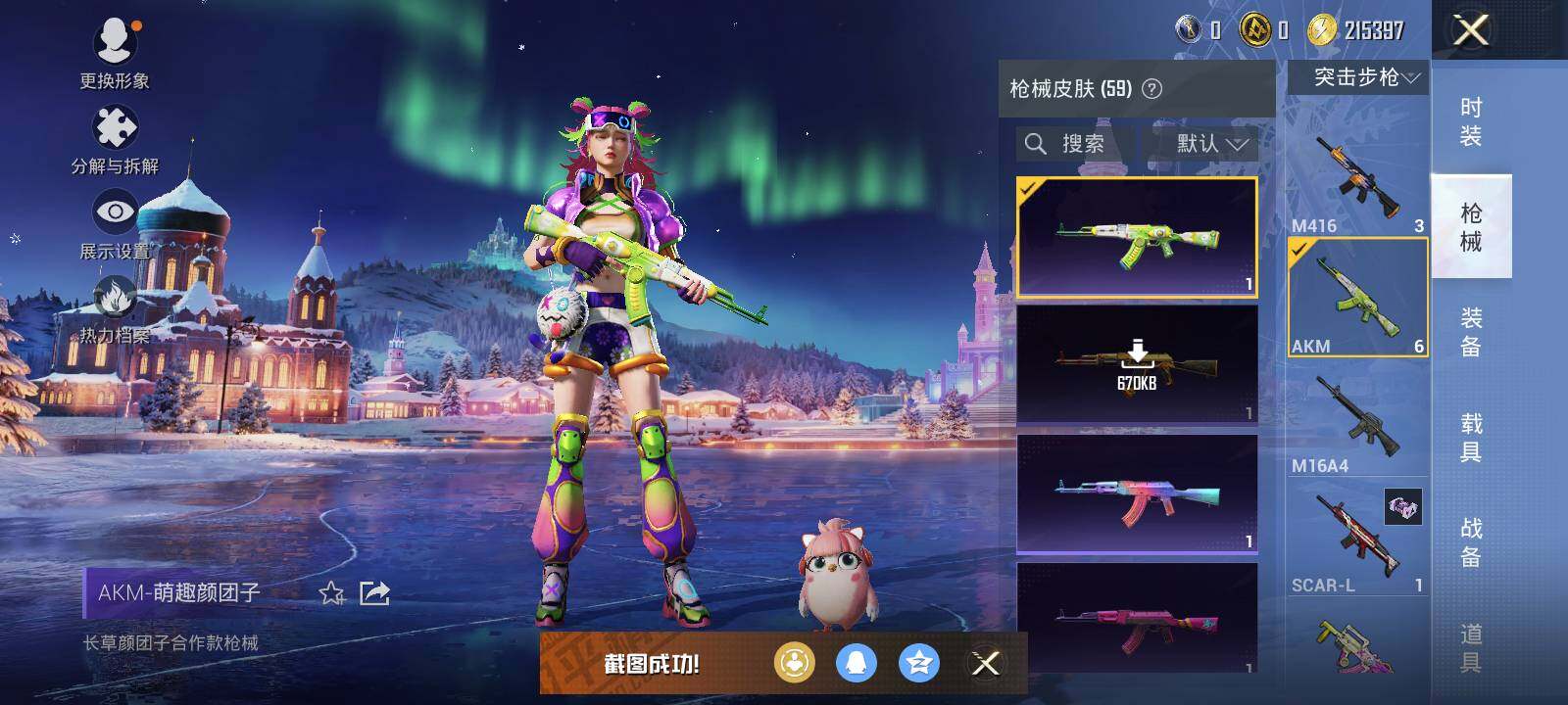 【稀有枪皮】:AKM-彩虹符号,AKM-生命誓言,AKM-破晓战魂,AKM-萌趣颜团子,AKM-虎虎生威,AKM-霓虹街区,SCAR-L-红色方程式,M416-红色方程