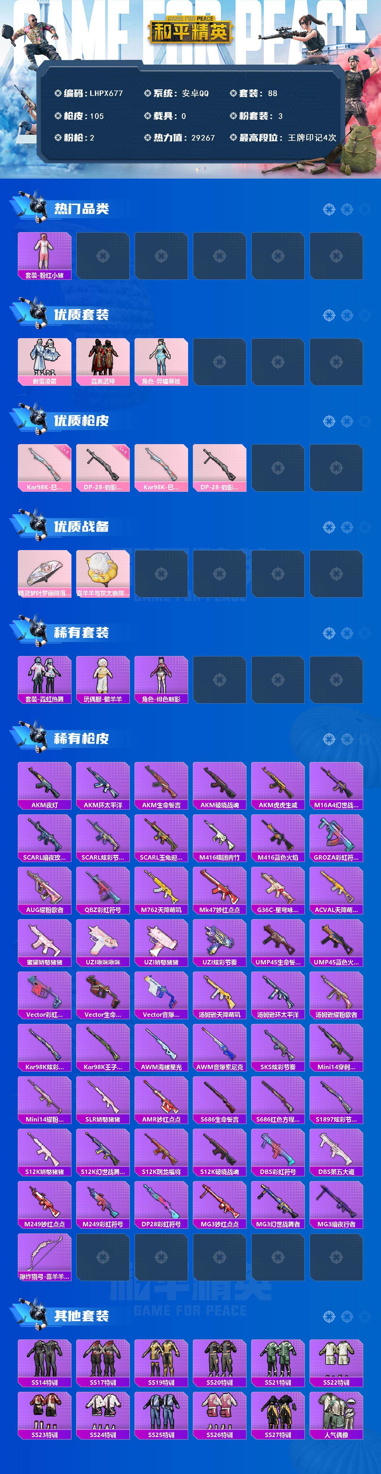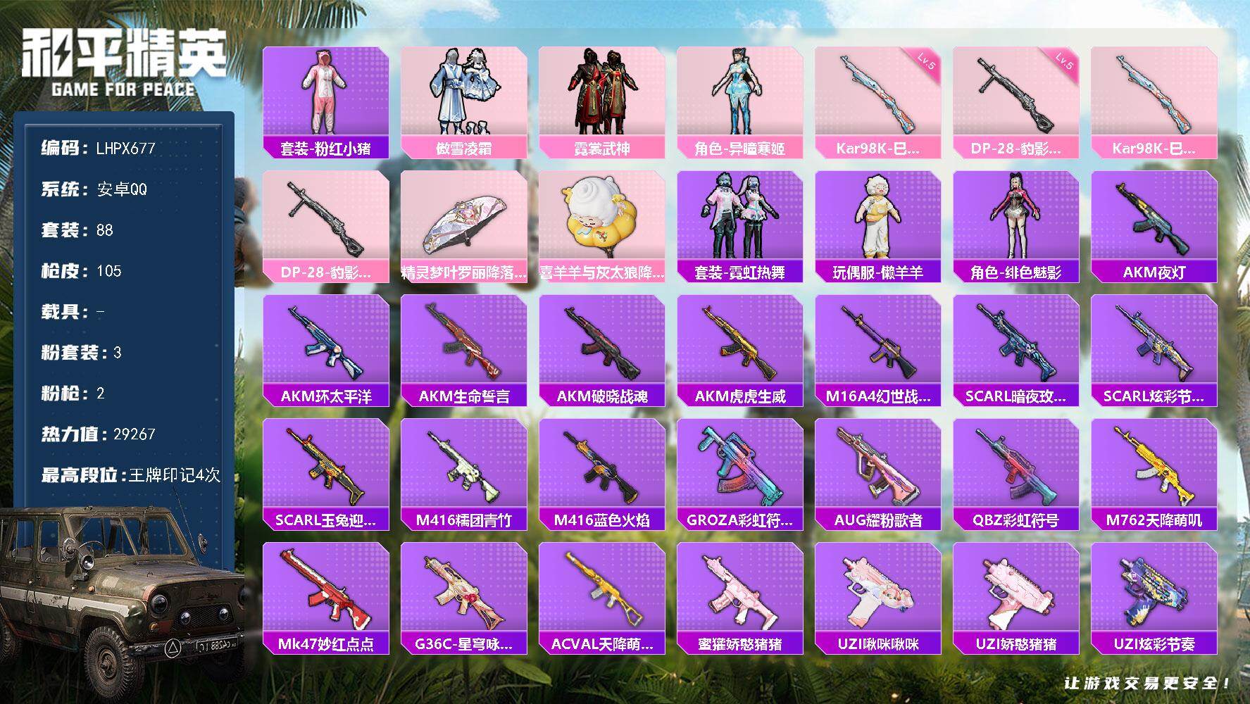 【特价出售/店主推荐】安卓 手Q-3粉装-2特效枪-0载具-1粉色飞行器-29267热力值-4王牌印记-88套装-105枪皮