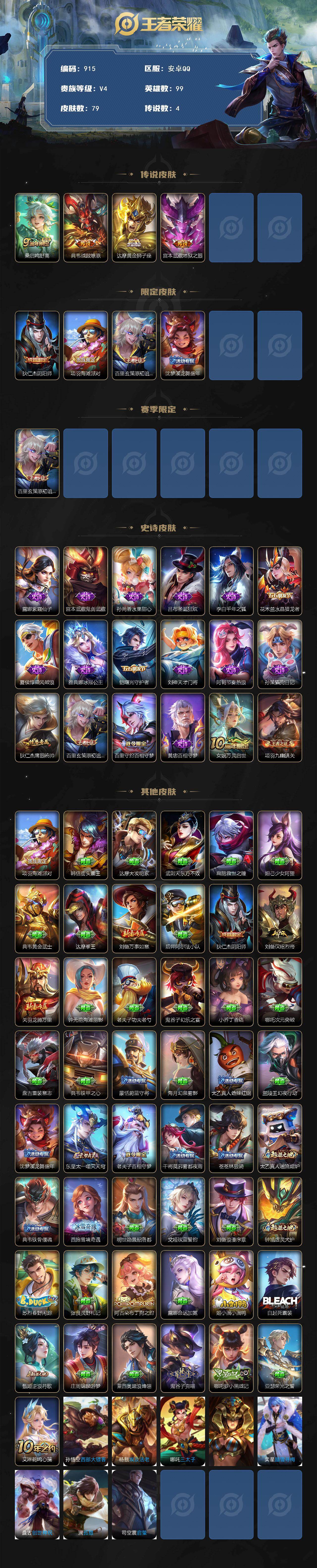 2039166 金标万战典韦 安卓Q-V4-至尊星耀IV段位-99英雄-79皮肤-4传说-18史诗