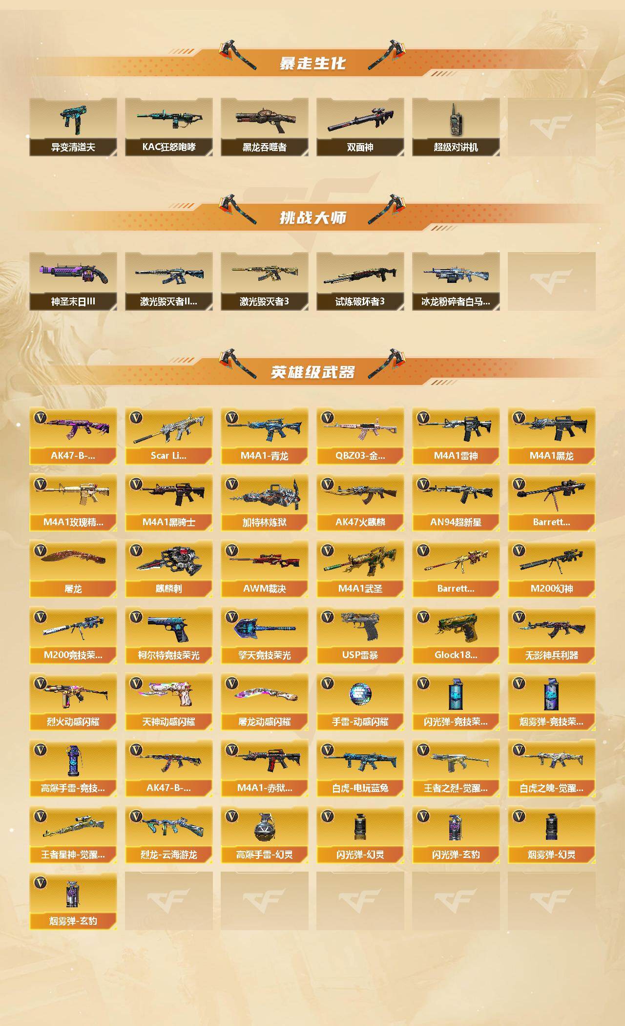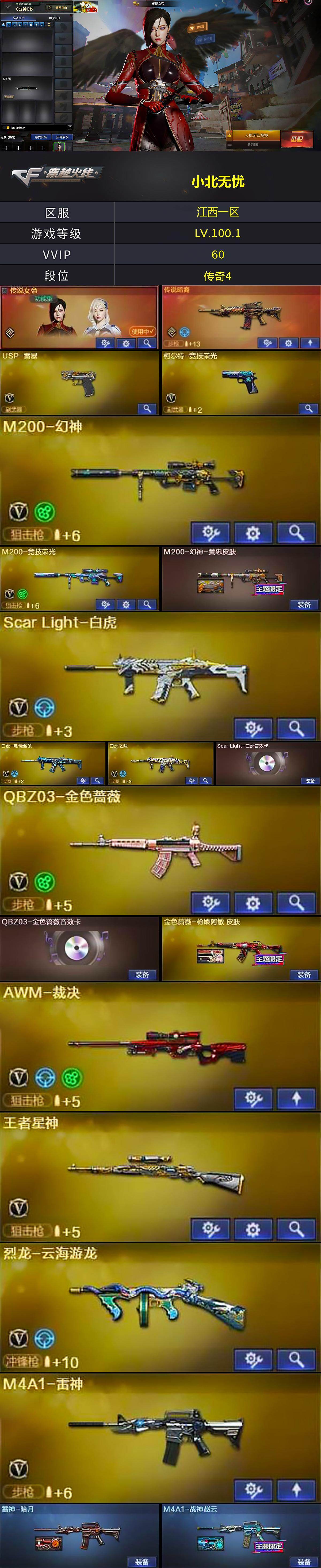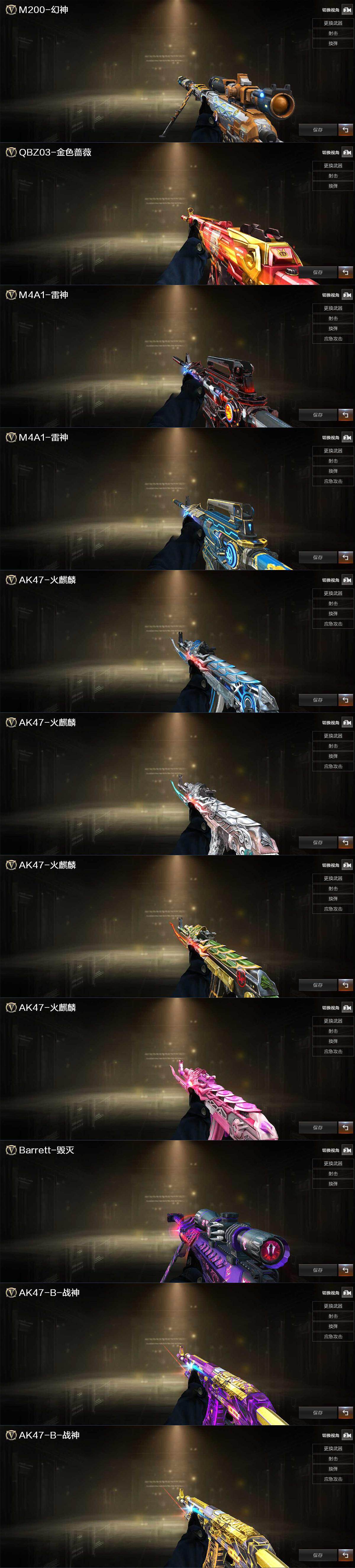 【热门武器】:传说暗裔,QBZ03-金色蔷薇,Scar Light-白虎,M4A1-青龙,M200-幻神,M200-竞技荣光,白虎-电玩蓝兔,C.A.T,炼狱-迷你小钢,M4A1-黑骑士,加特林-炼狱*2,金色蔷薇-空,斯泰尔-蝴蝶,USP-雷暴