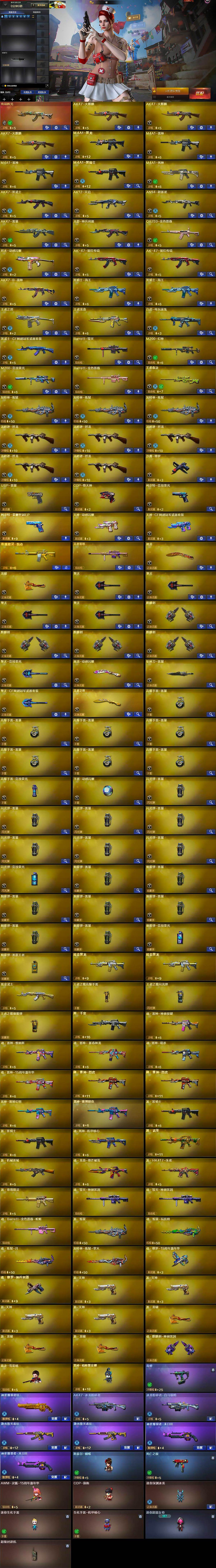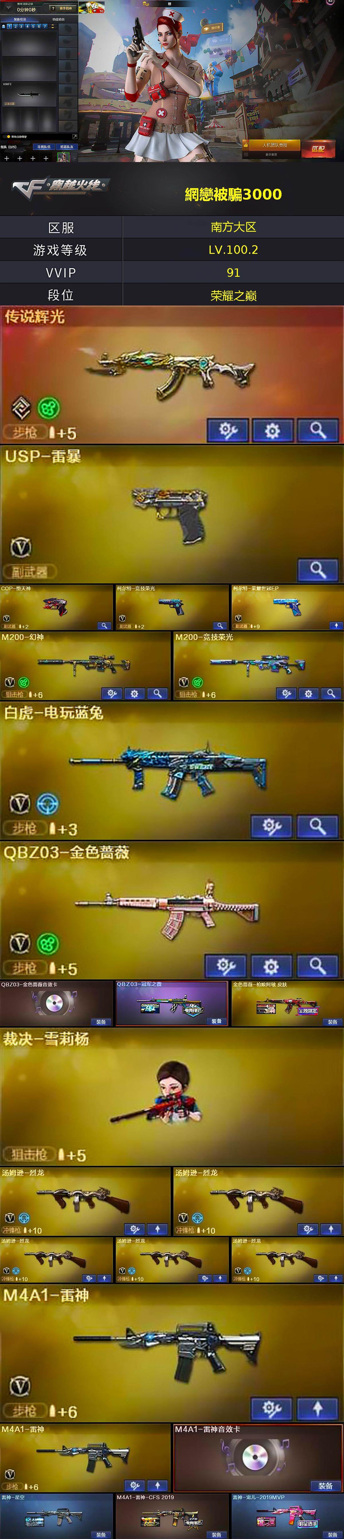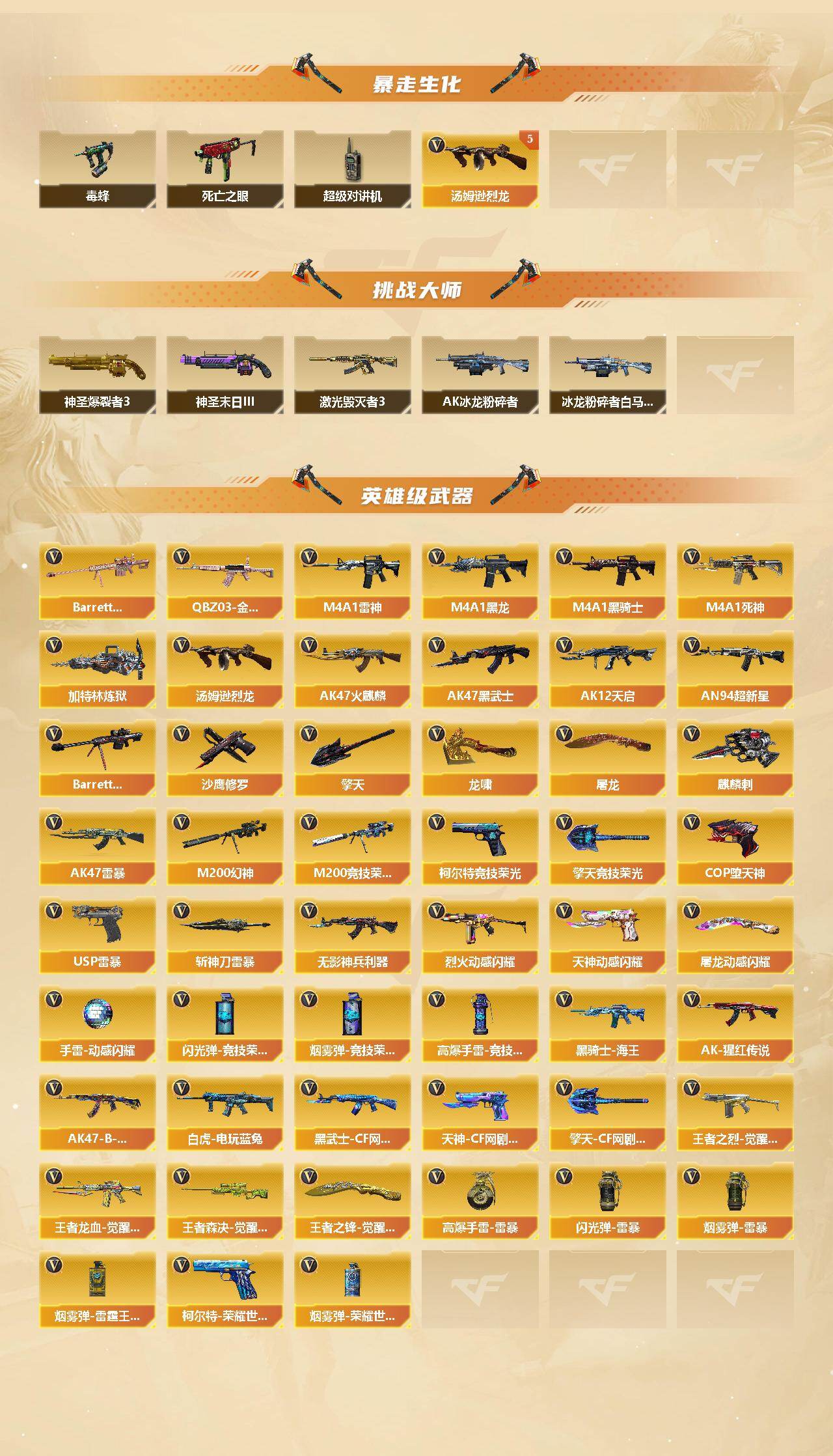 【热门武器】:传说辉光,QBZ03-金色蔷薇,M200-幻神,M200-竞技荣光,死亡之眼,白虎-电玩蓝兔,毒蜂,M4A1-黑骑士,汤姆逊-烈龙*5,加特林-炼狱*3,斯泰尔-蝴蝶,裁决-雪莉杨,USP-雷暴,COP-堕天神,沙鹰-修罗,金刚伞