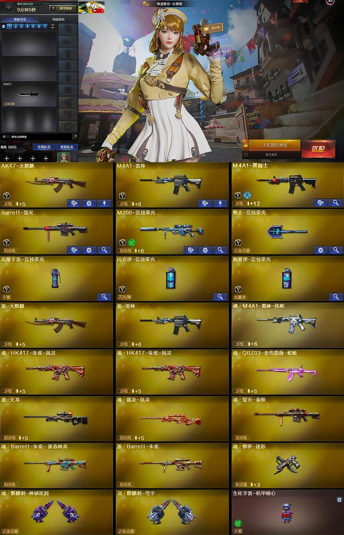 【英雄级武器】:AK47-火麒麟,M4A1-雷神,M4A1-黑骑士,Barrett-毁灭,M200-竞技荣光,擎天-竞技荣光,高爆手雷-竞技荣光,闪光弹-竞技荣光,烟雾弹-竞技荣光