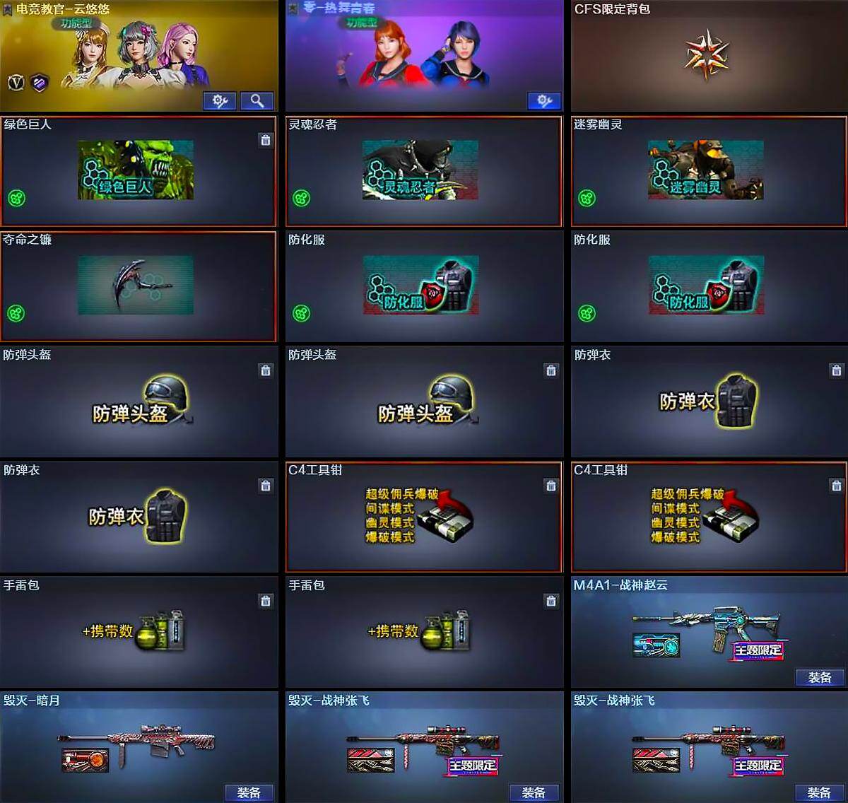 【道具】:CFS限定背包,绿色巨人,灵魂忍者,迷雾幽灵,夺命之镰,防化