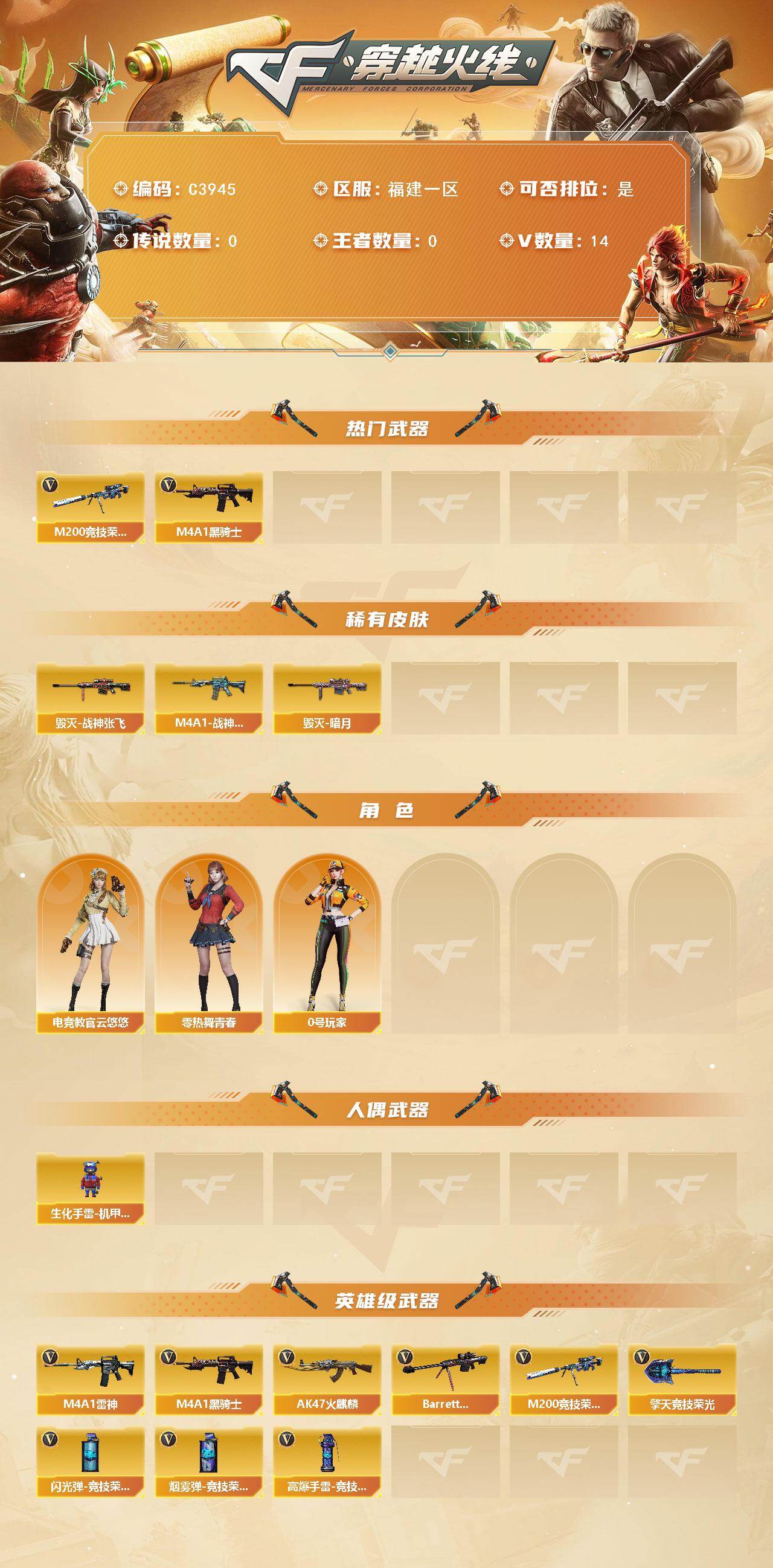 【C3945】福建一区-14V-0王者-0炫金