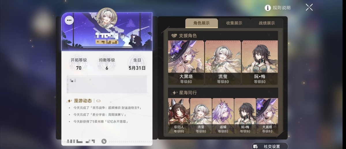 动态名片,流萤皮肤,角色池垫60,光锥垫25,,剩一个金灵没用,3.8剧情活动一点没做