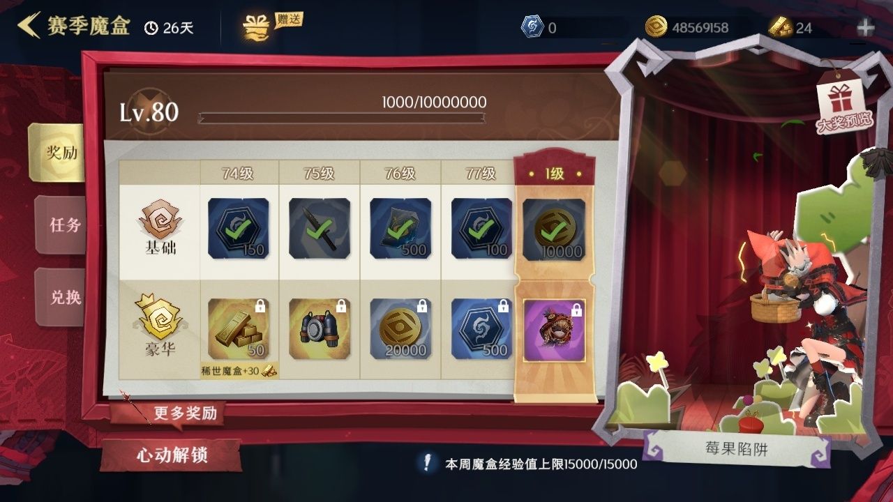ZR136,红皮:0,金皮:1,紫皮:1,道具皮:4,铲铲币:4856w,累充:3580金砖,金色皮肤:巫铃儿-镜花辞,紫色皮肤:薇薇安-仙锋小姐,员工:小黄、爱丽丝、零、薇薇安、巫铃儿、小黄、爱丽丝、零、薇薇安、巫铃儿、小黄、爱丽丝、零、薇薇安、巫铃儿、兰,段位:超自然传说,赛季魔盒:普通魔盒,道具皮肤:急救包-蔷薇物语、电击枪-甜蜜泡泡枪、腰包-宝剑八、额外的背包-飞花令,头饰:樱桃奶油布丁、