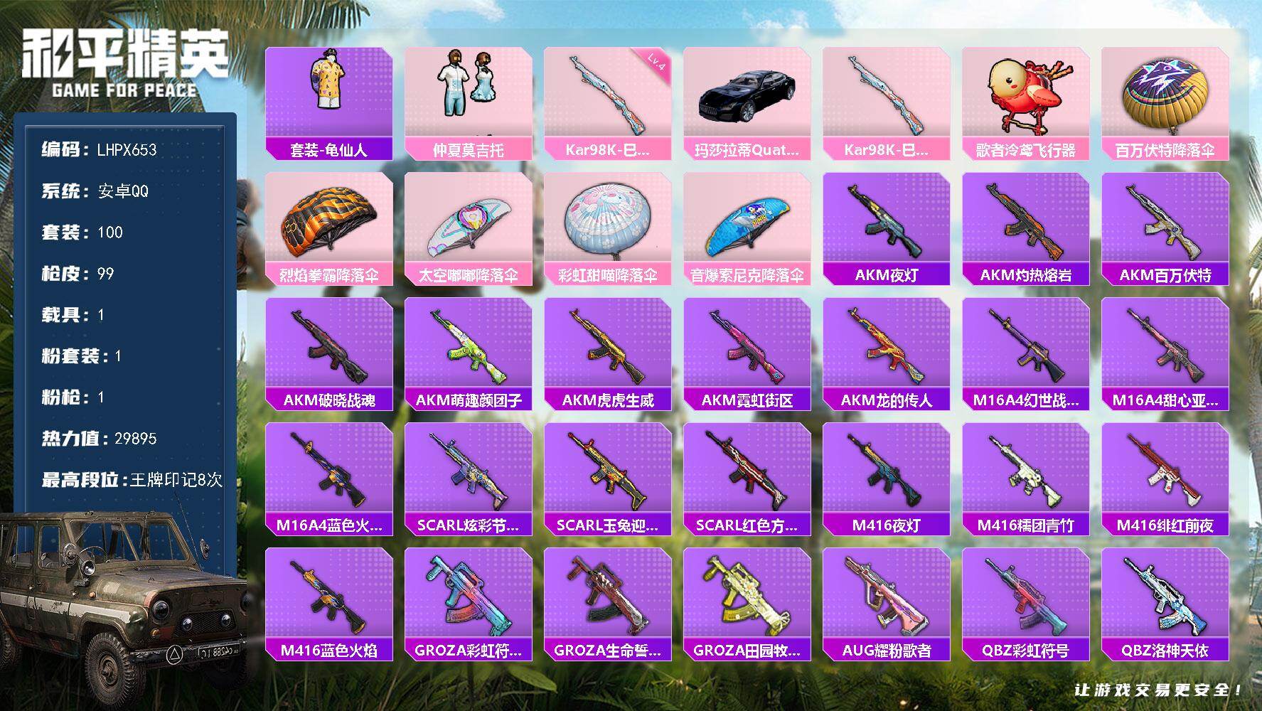 【店主推荐捡漏号!可直接换绑】安卓 手Q-1粉装-1特效枪-1载具-1粉色飞行器-29895热力值-8王牌印记-100套装-99枪皮