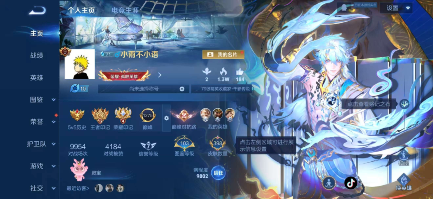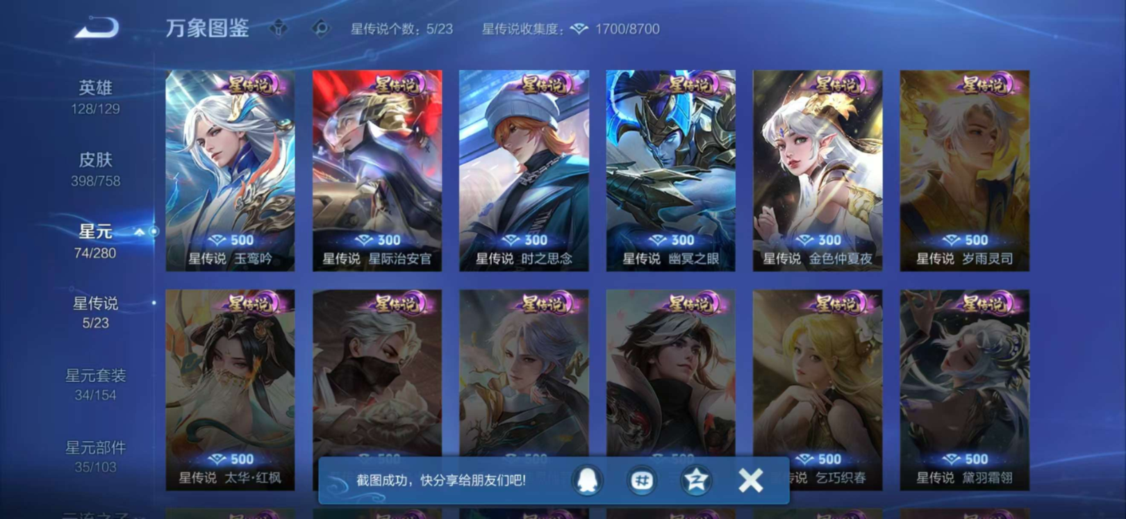安卓QQ/至尊星耀/398皮肤/128英雄/2典藏/0珍品无双/2无双/2珍品传说/47传说/124史诗/9稀有英雄