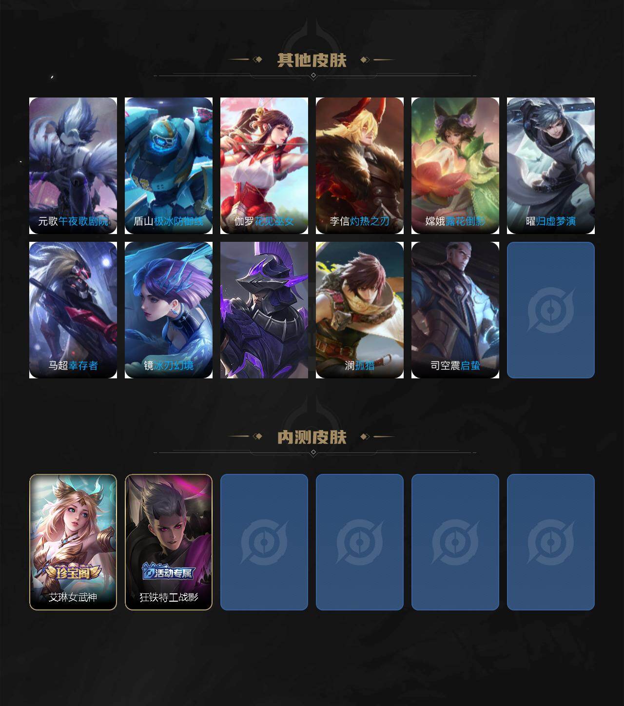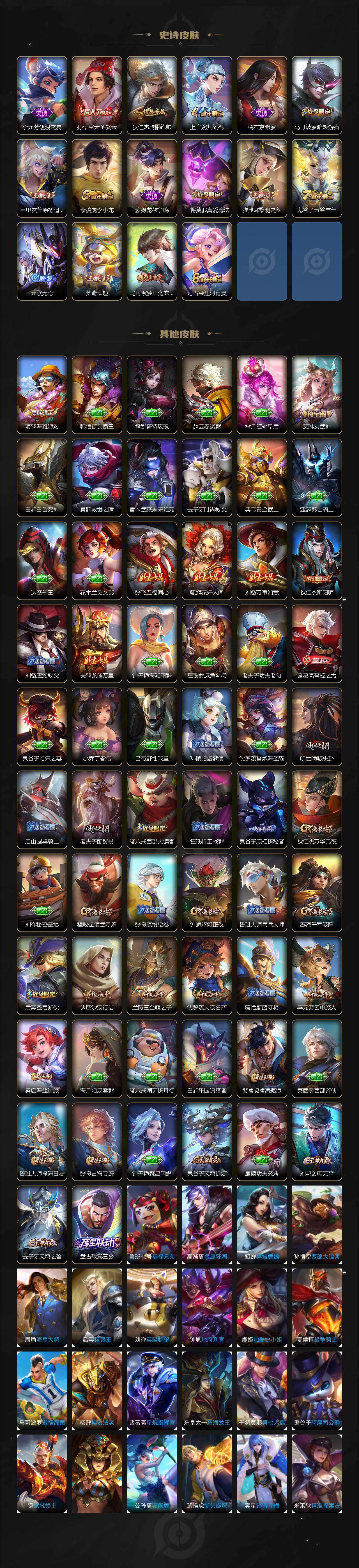 【限定皮肤】:姜子牙天穹之誓,狄仁杰阴阳师,赵云皇家上将,元歌无心,马可波罗暗影游猎,马可波罗山海玄木吟,狄仁杰魔术师,狄仁杰万华元夜,达摩沙漠行僧,项羽海滩派对,老夫子醍醐杖,程咬金演武夺筹,兰陵王金庭之子,孙悟空大圣娶亲,后羿圣弓游侠,李元芳云中旅人,钟馗驱傩正仪,干将