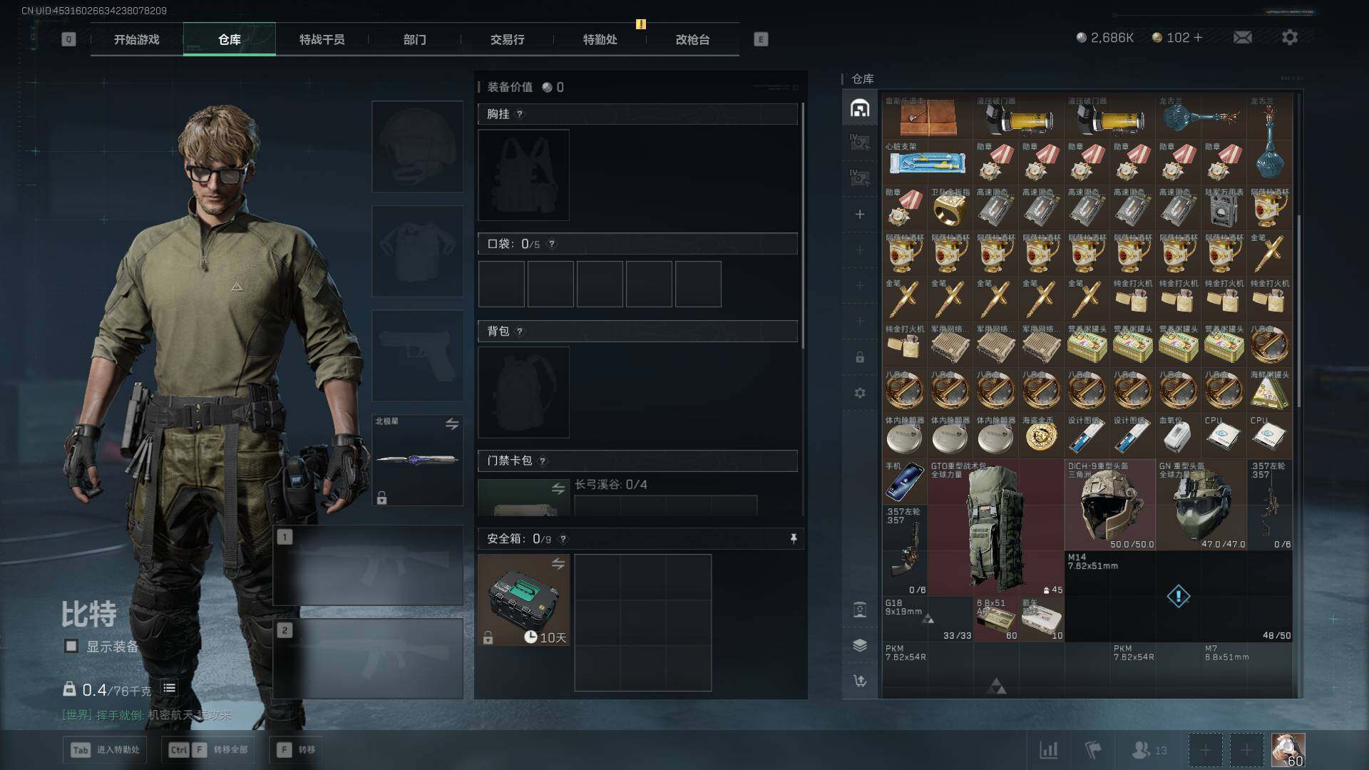 总资产(M):193M/哈夫币(K):2686K/传说枪皮数:25/全面战场等级:25_段位:上等兵/烽火地带等级:60_段位:黄金/