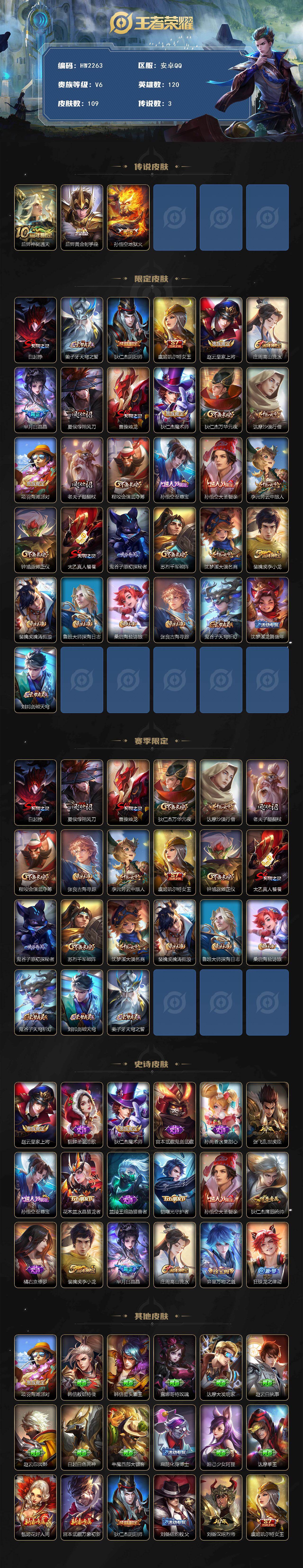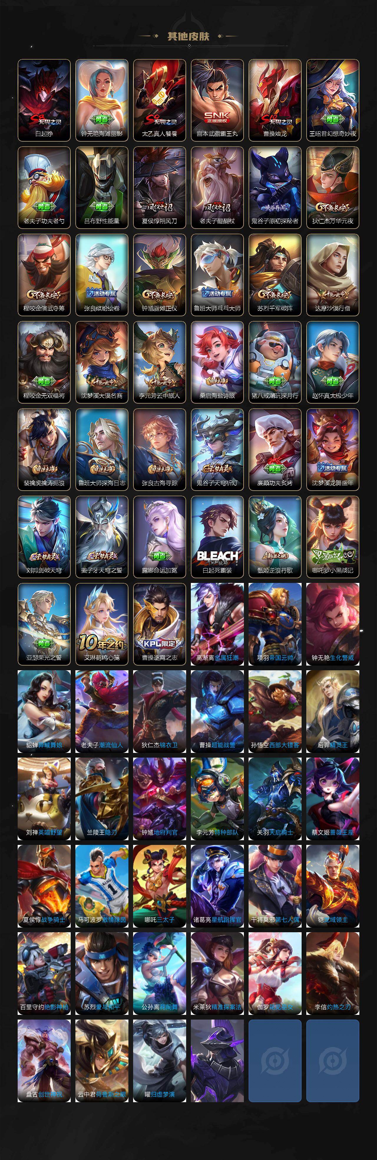 【限定皮肤】:白起狰,姜子牙天穹之誓,狄仁杰阴阳师,虞姬凯尔特女王,赵云皇家上将,庄周高山流水,芈月白晶晶,夏侯惇朔风刀,曹操烛龙,狄仁杰魔术师,狄仁杰万华元夜,达摩沙漠行僧,项羽海滩派对,老夫子醍醐杖,程咬金演武夺筹,孙悟空至尊宝,孙悟空大圣娶亲,李元芳云中旅人,钟
