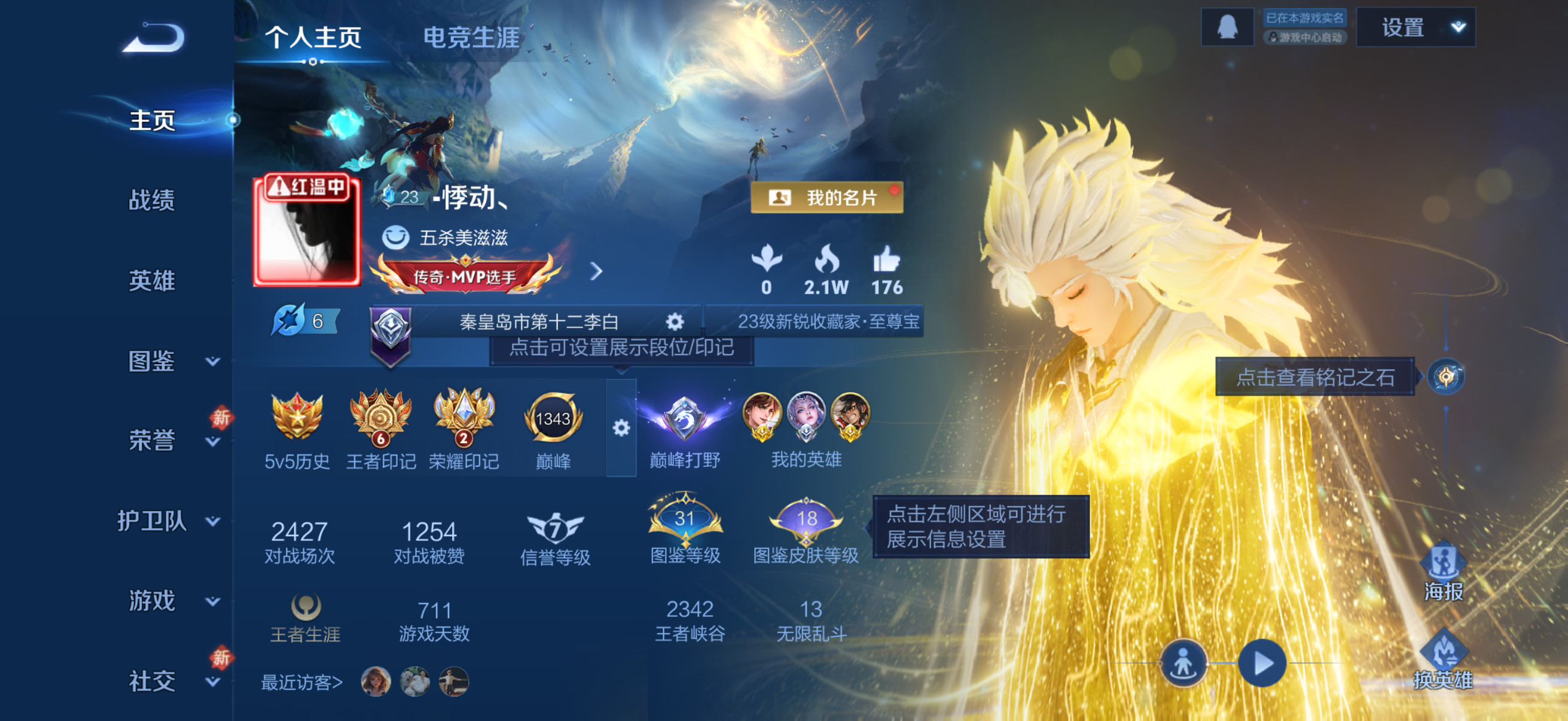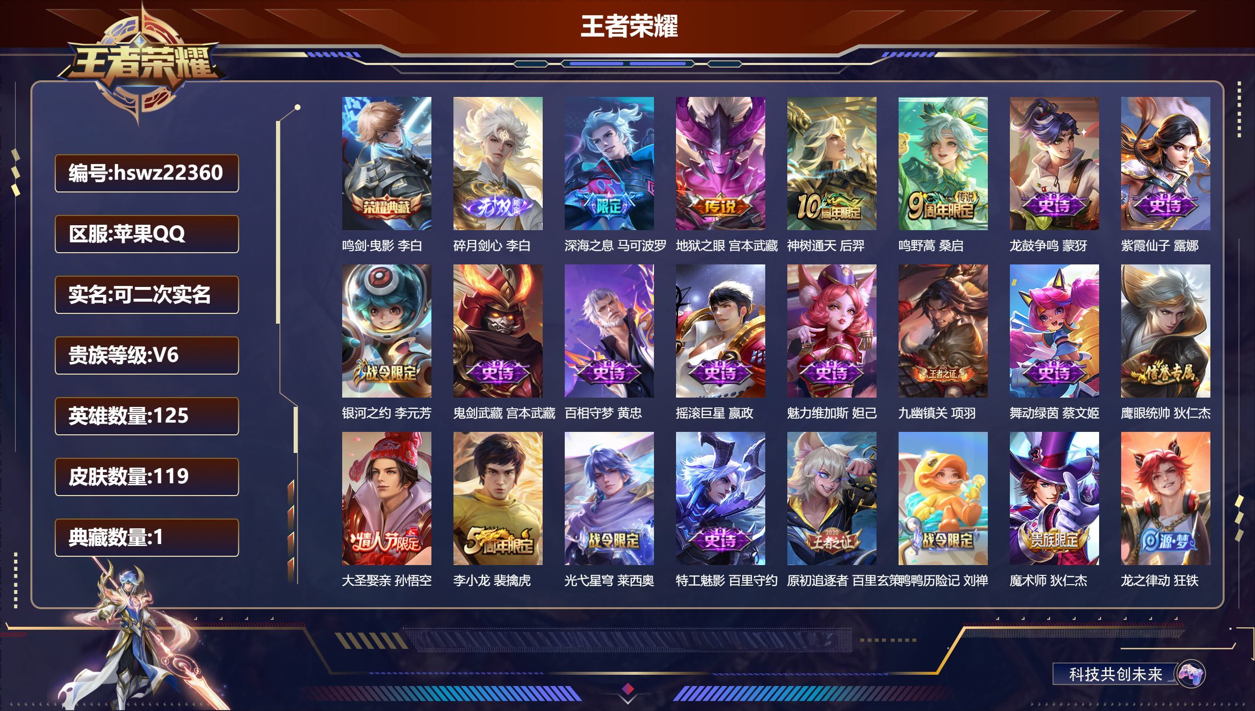 苹果QQ/至尊星耀/119皮肤/125英雄/1典藏/0珍品无双/1无双/0珍品传说/4传说/37史诗