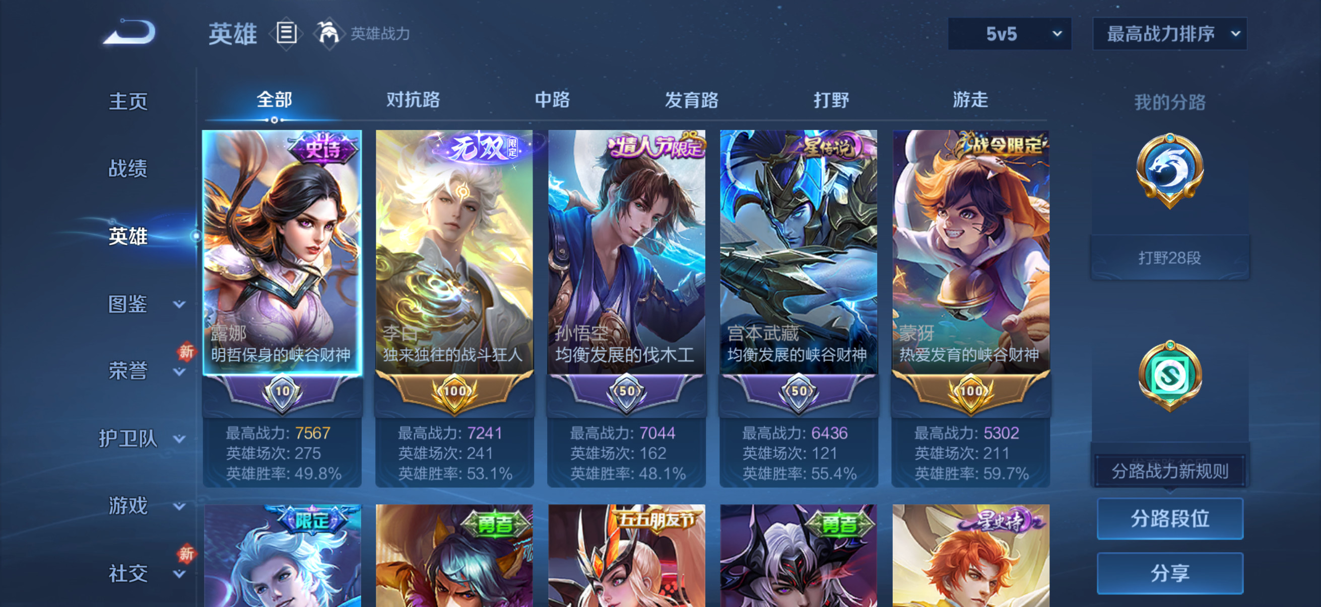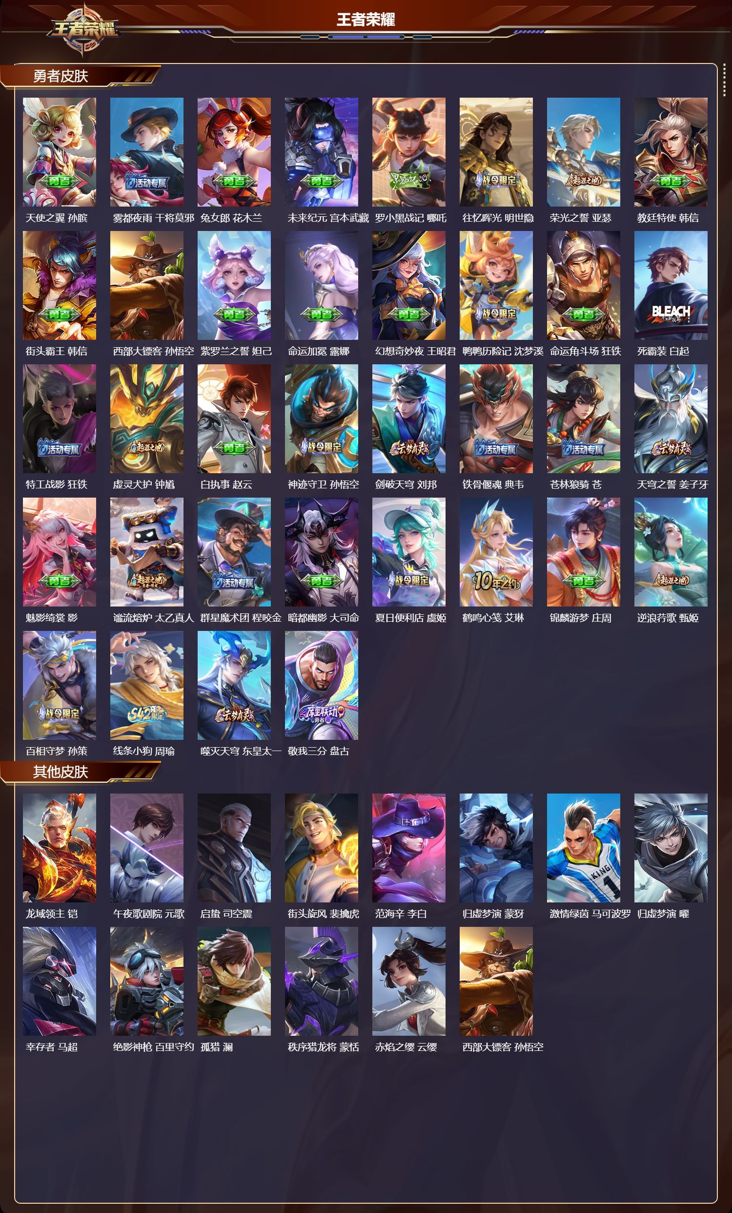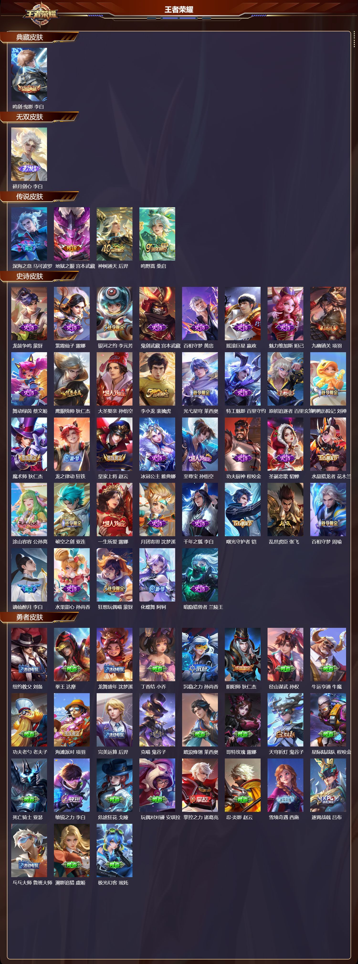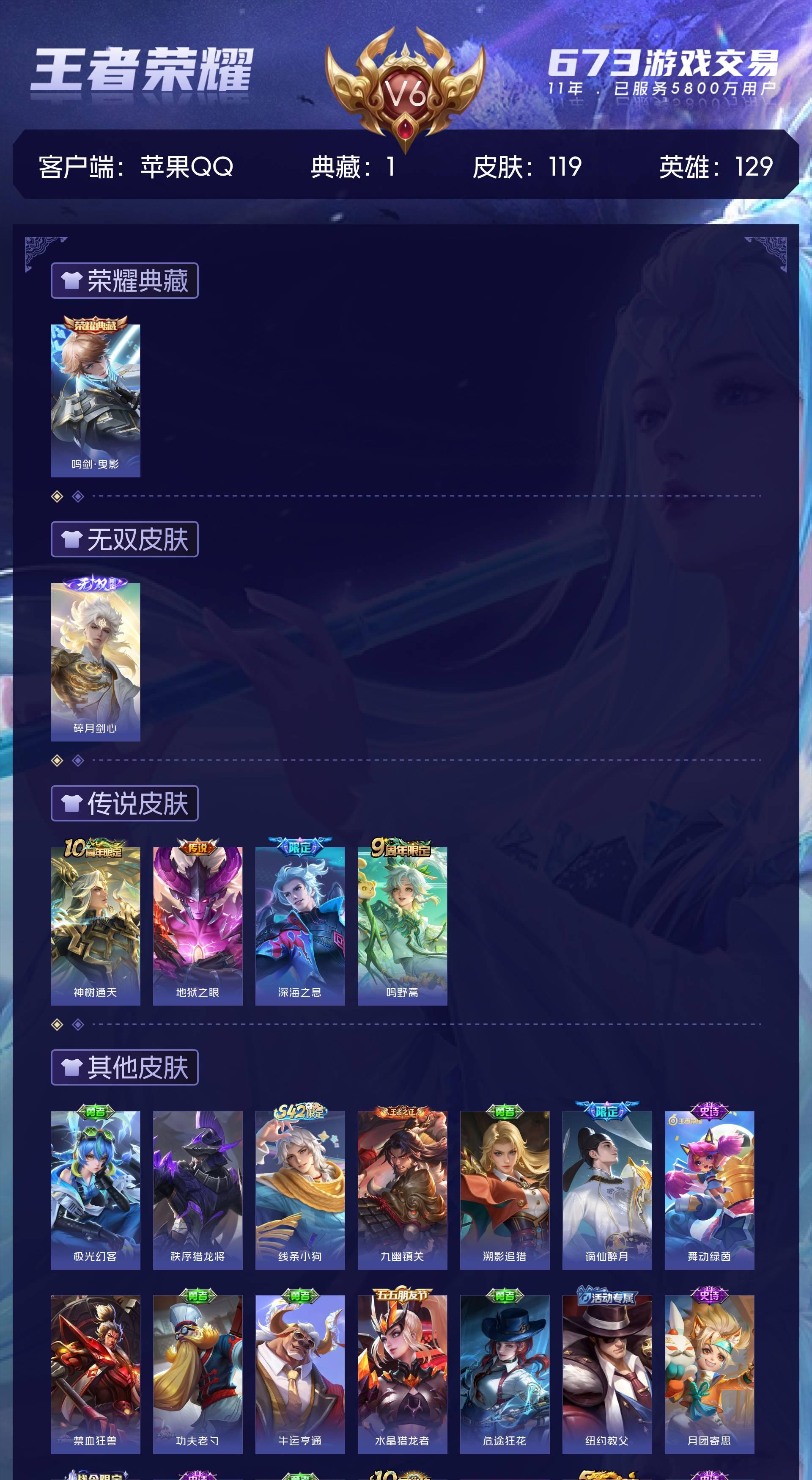V6 皮肤119 英雄129 至尊星耀 荣耀典藏1 无双皮肤1 传说4 其他皮肤119