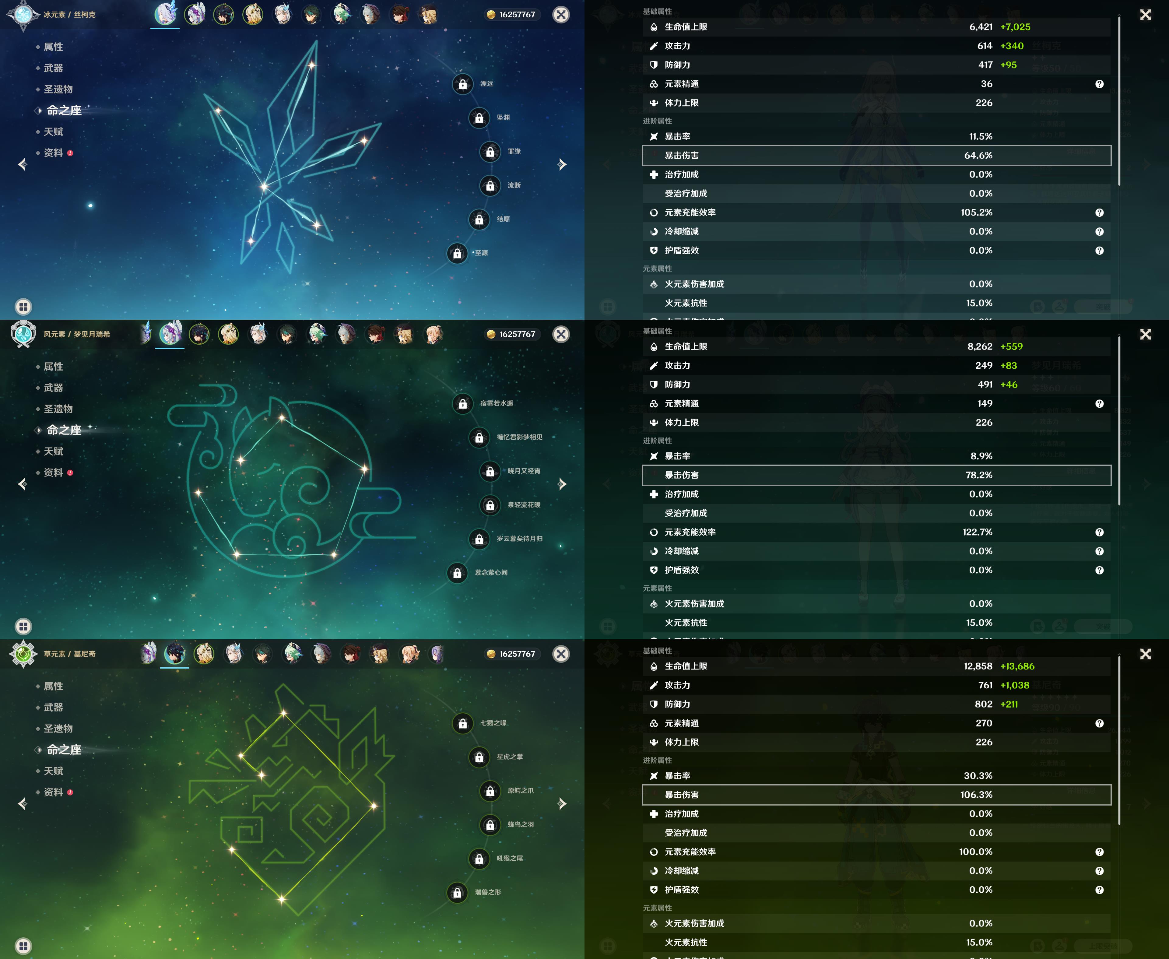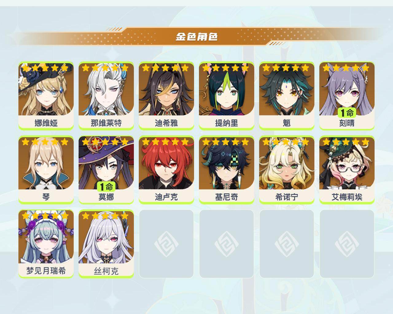 【YSX1508】55级/16黄/女主/14个五星角色/0命丝柯克/梦见月瑞希/基尼奇/希诺宁/那维莱特/魈/娜维娅/琴/1命刻晴/迪卢克/艾梅莉埃/提纳里/迪希雅/1命莫娜