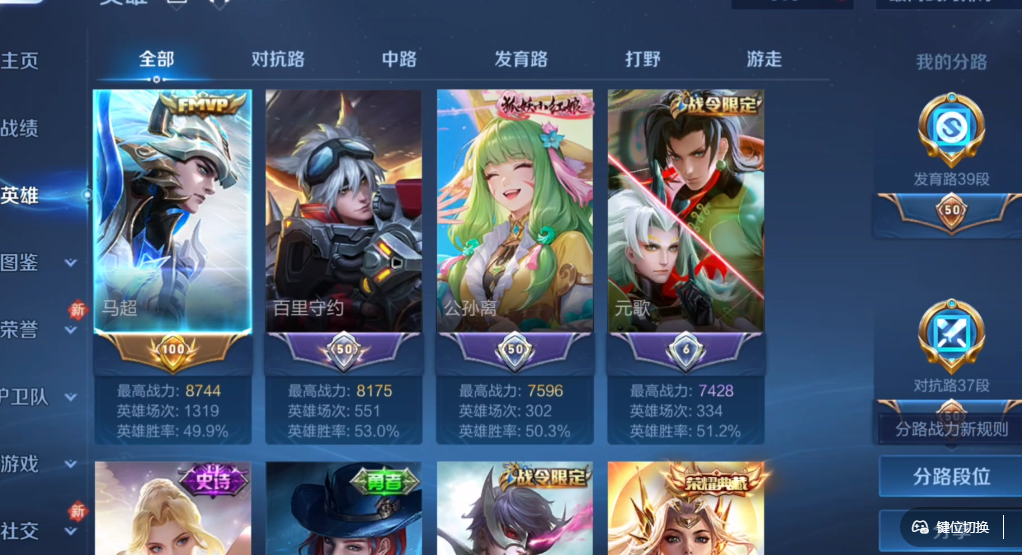 发育路39段,对抗路37段,速抢!王者成品号,铭文全满+热门皮肤齐