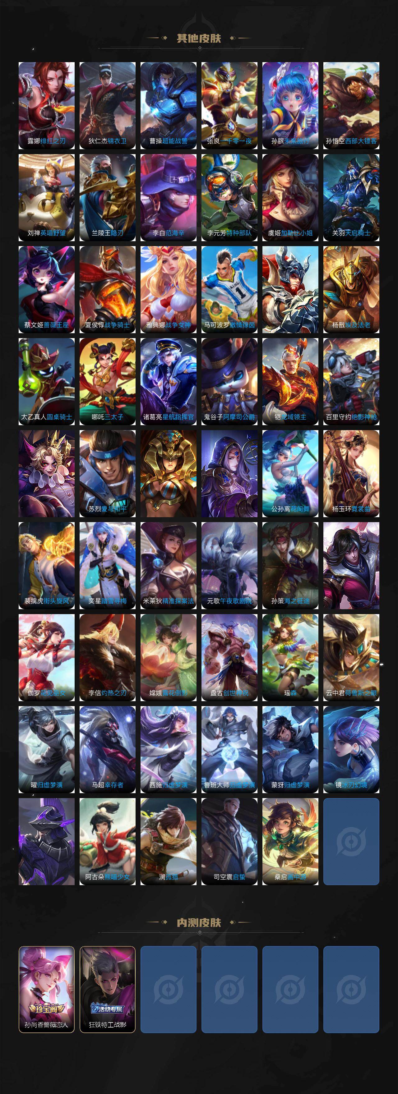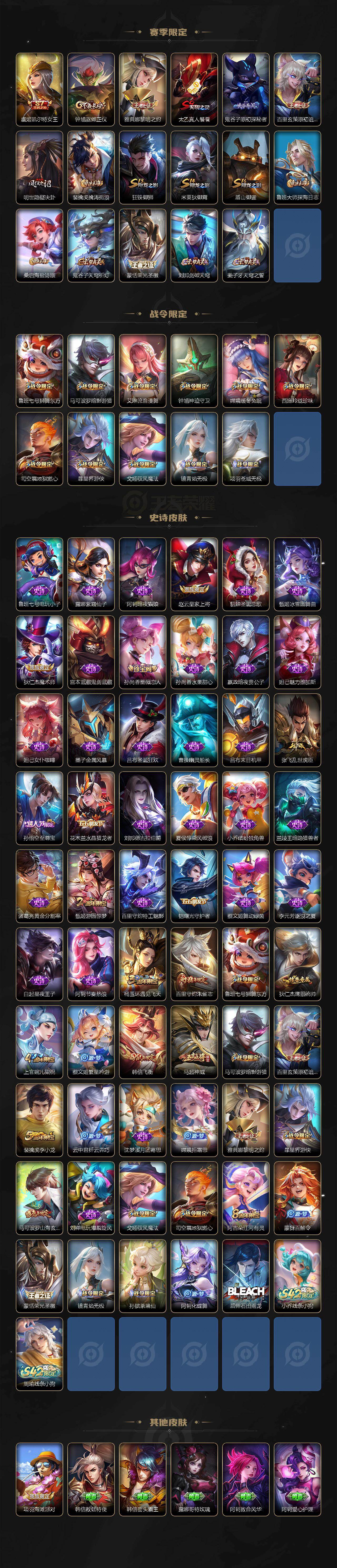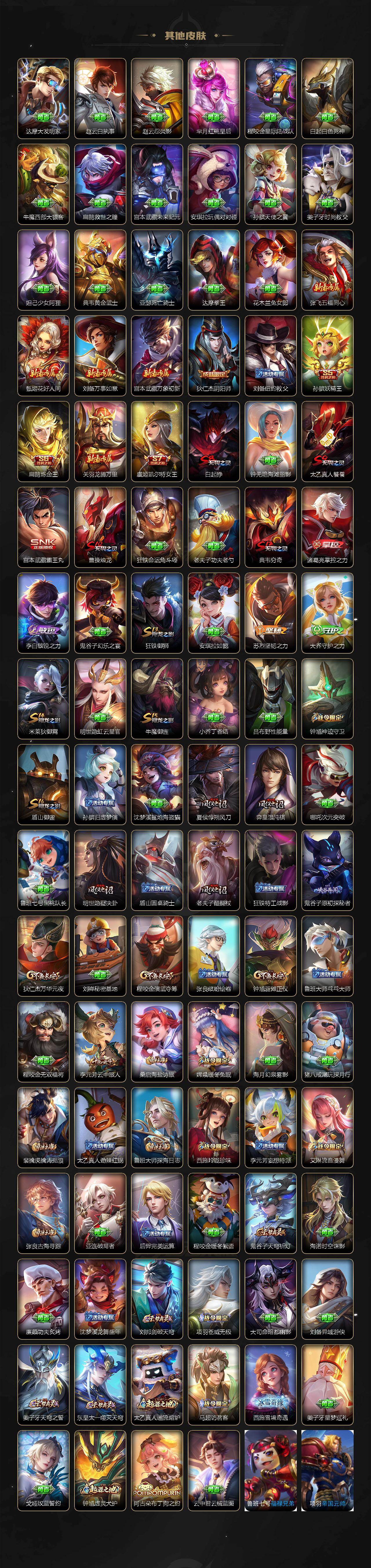【限定皮肤】:白起狰,姜子牙天穹之誓,狄仁杰阴阳师,虞姬凯尔特女王,赵云皇家上将,孙