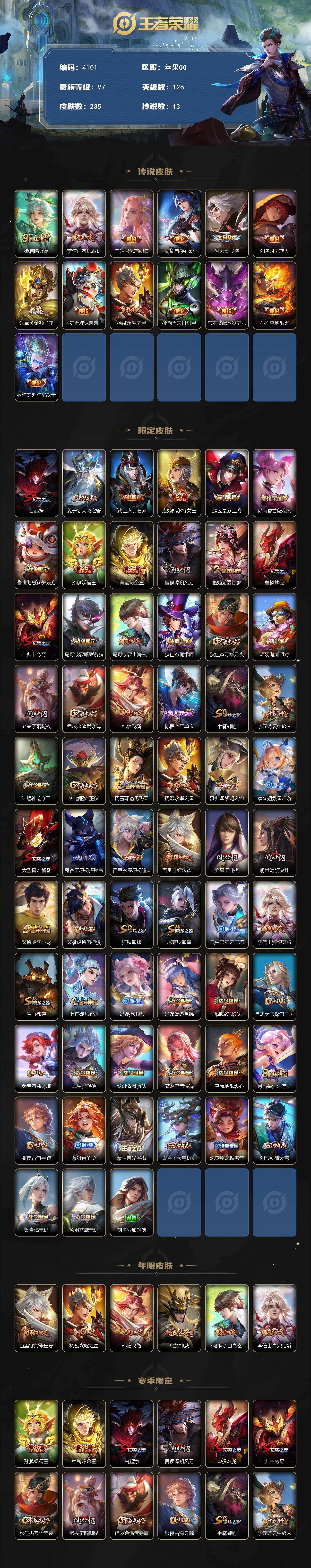 苹果Q-V7-至尊星耀IV段位-126英雄-235皮肤-13传说-60史诗【