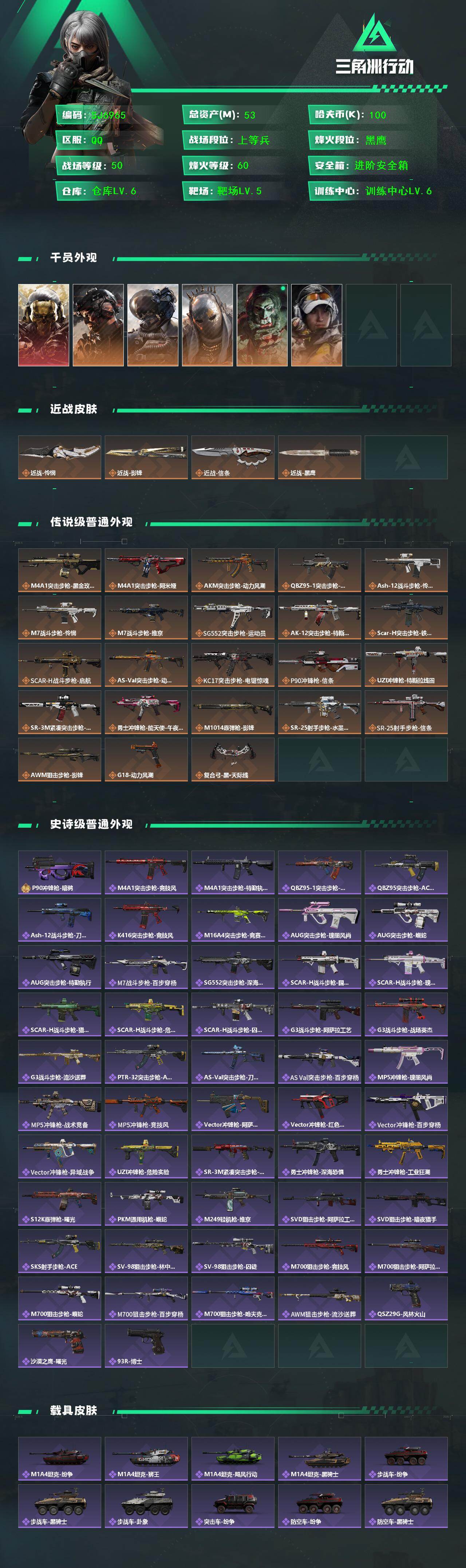总资产(M):53M/哈夫币(K):100K/传说枪皮数:23/全面战场等级:50_段位:上等兵/烽火地带等级:60_段位:黑鹰/