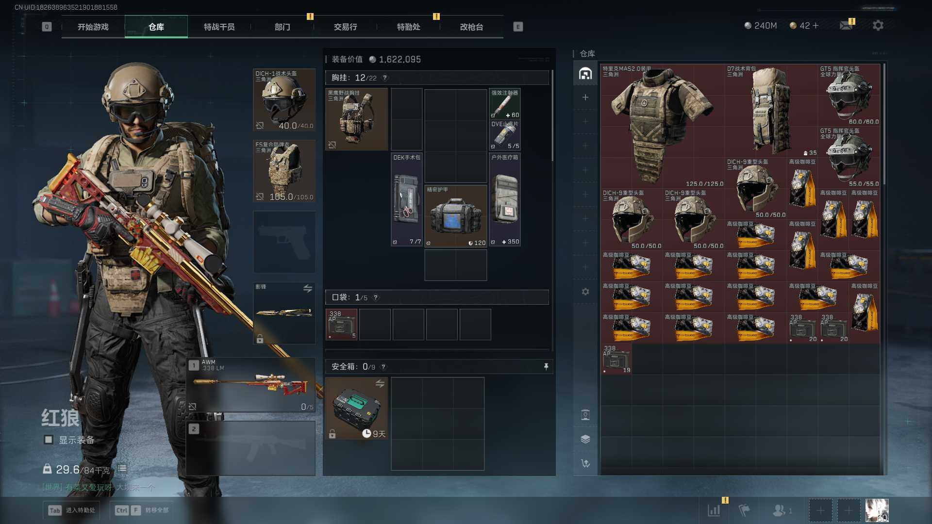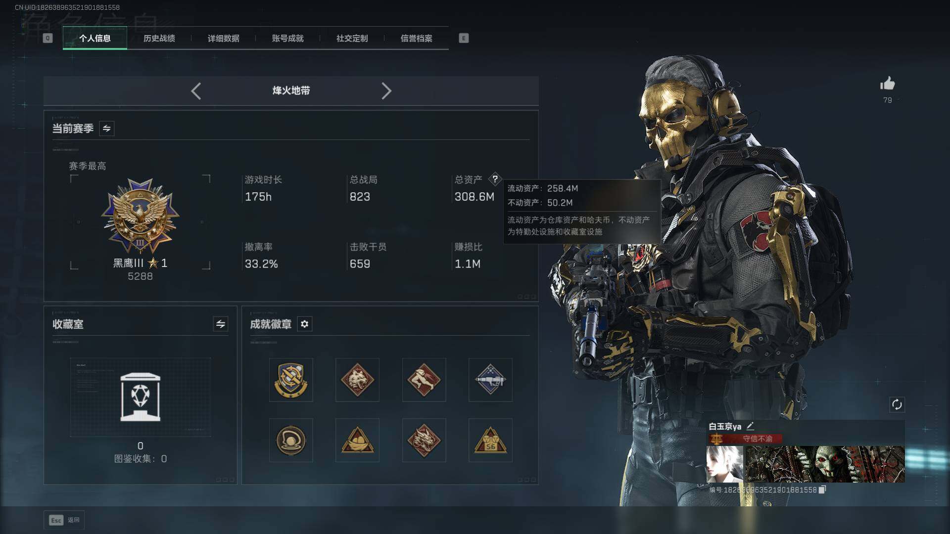 总资产(M):308M/哈夫币(K):240304K/传说枪皮数:19/全面战场等级:20_段位:上等兵/烽火地带等级:60_段位:黑鹰