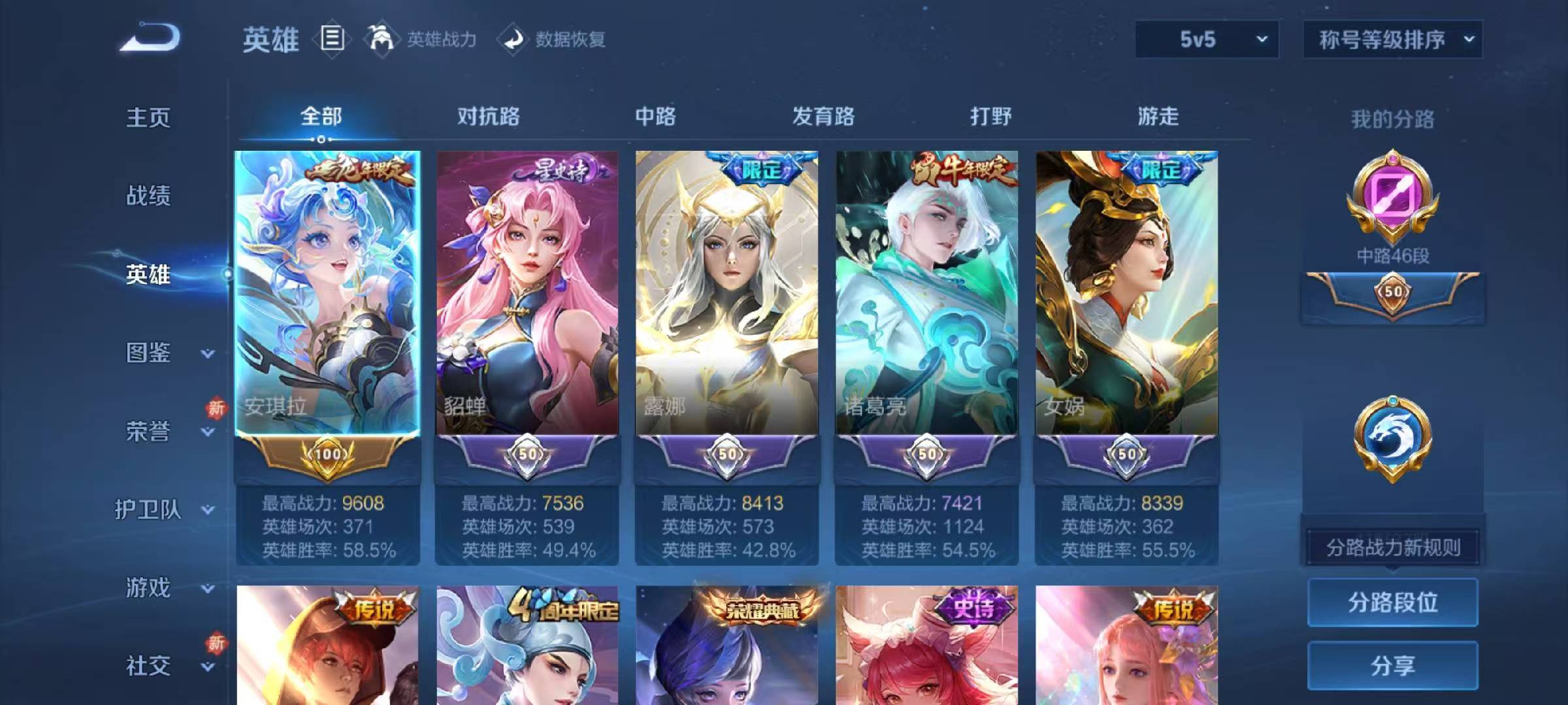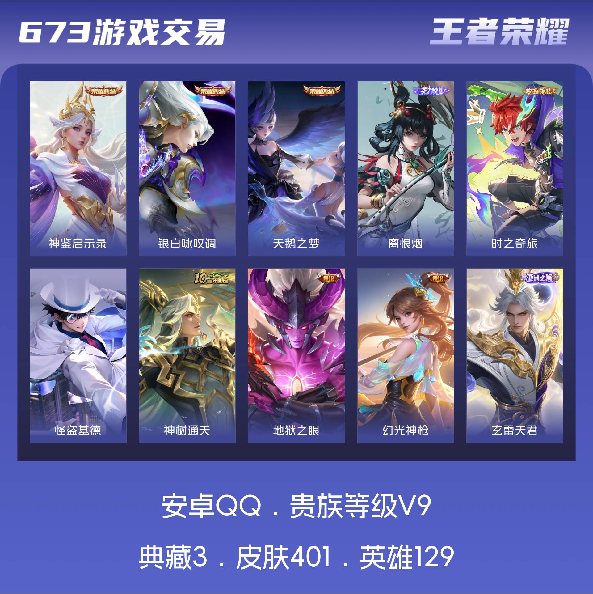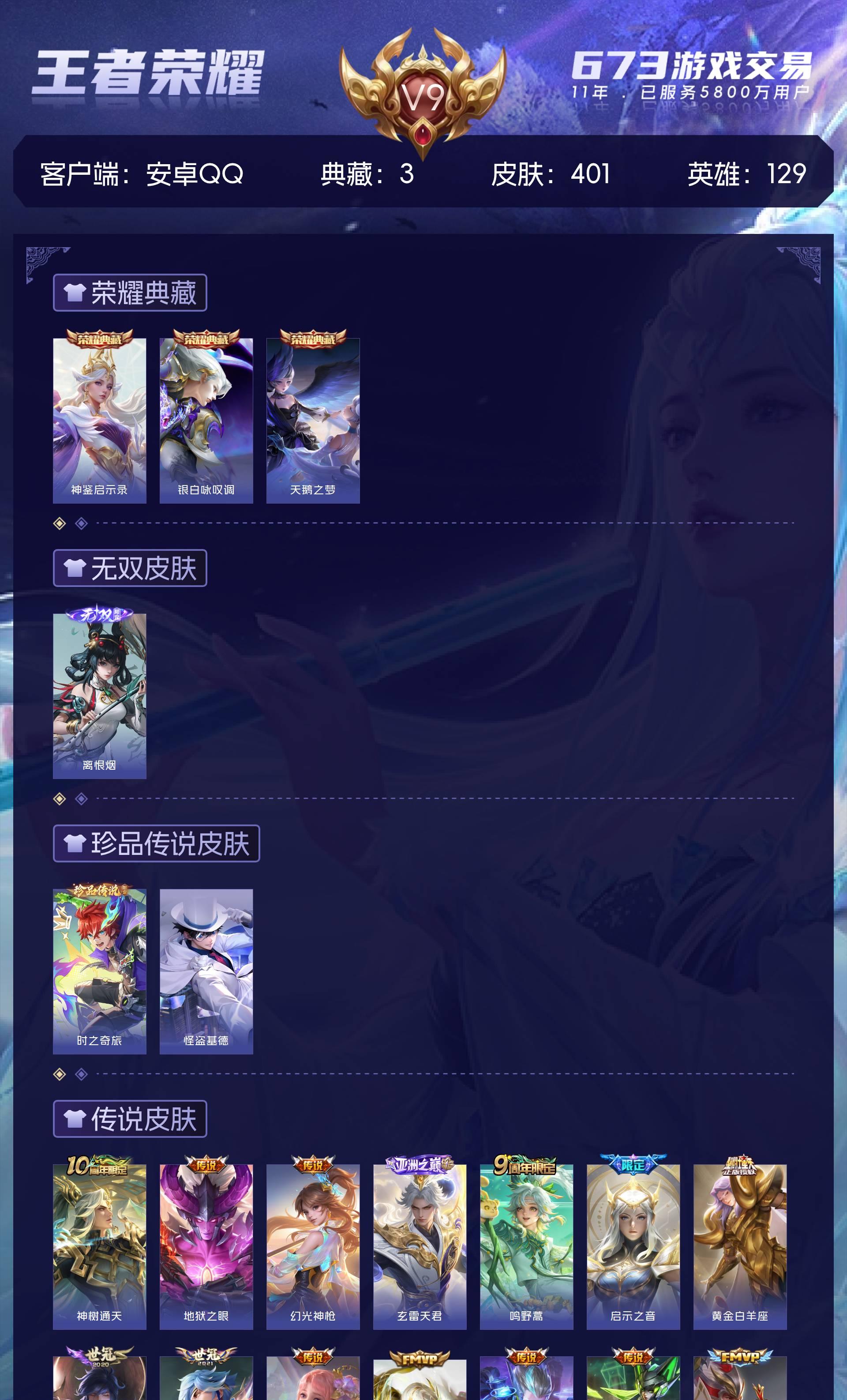 V9 皮肤401 英雄129 永恒钻石 荣耀典藏3 无双皮肤1 珍品传说2 传说21 其他皮肤379