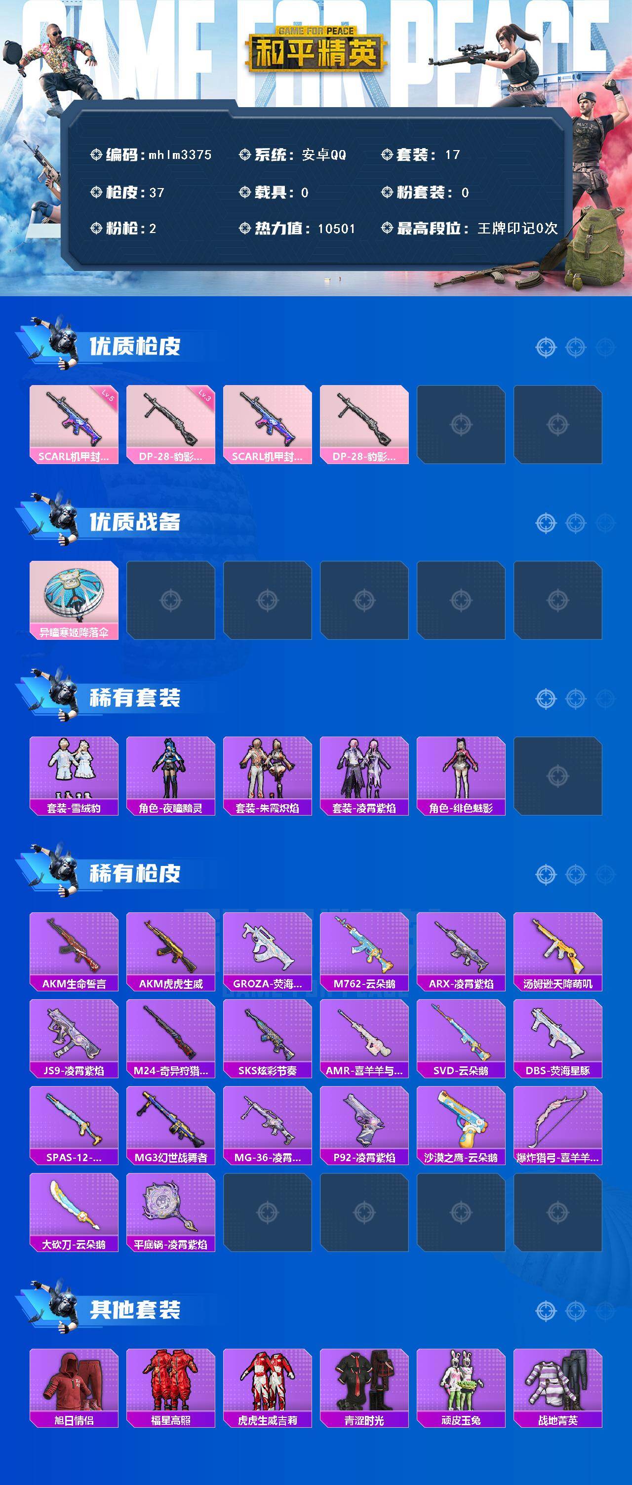 【mhlm3375】安卓 手Q-0粉装-2特效枪-0载具-0粉色飞行器-10501热力值-0王牌印记-17套装-37枪皮