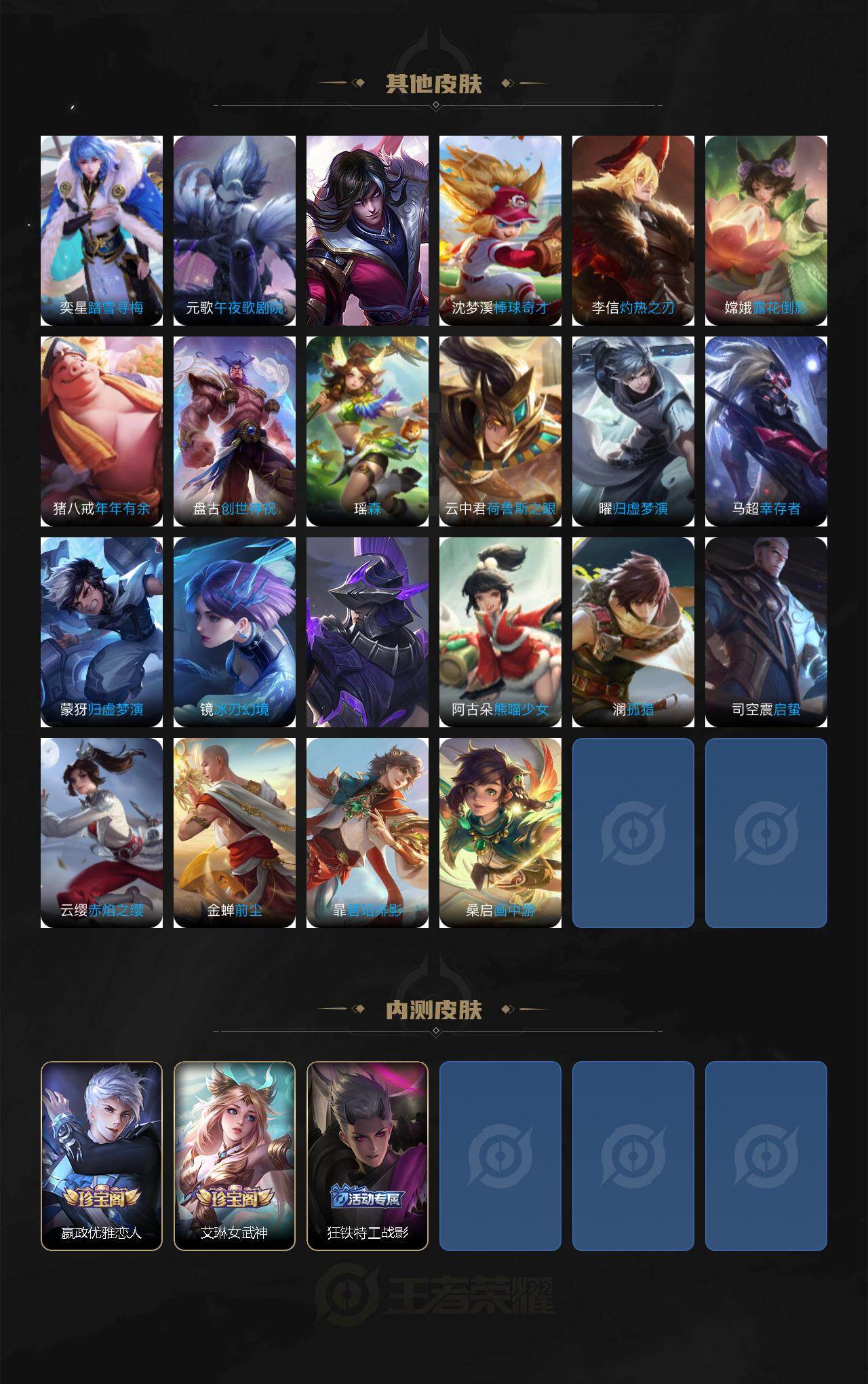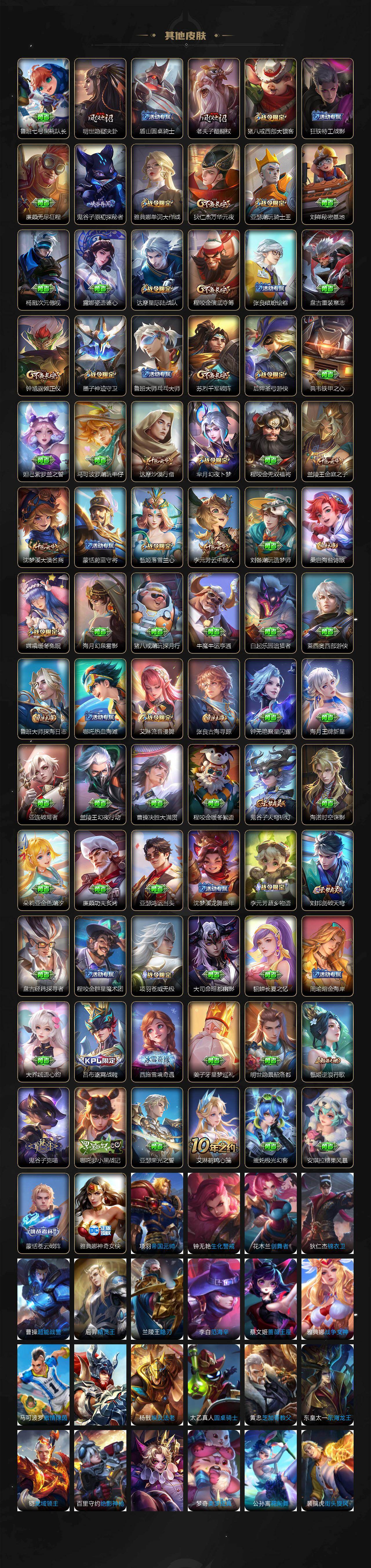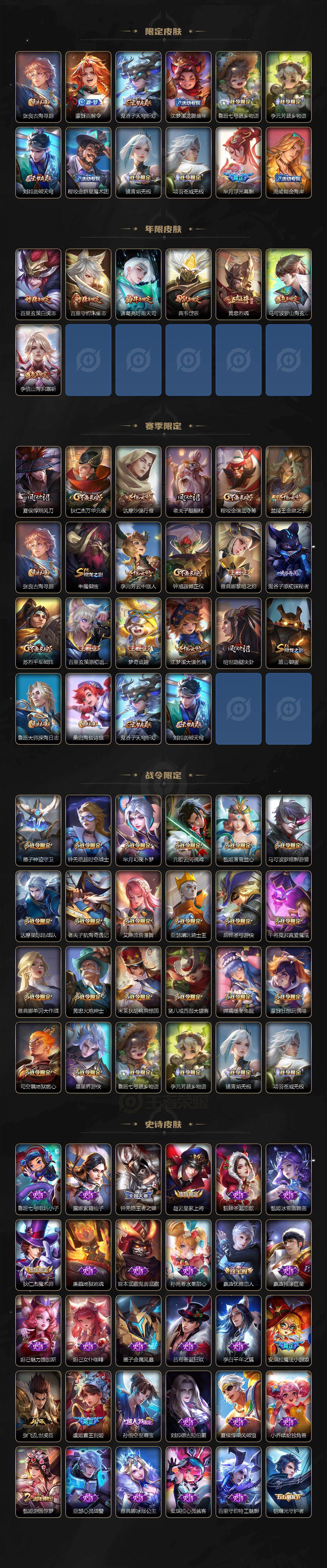 【传说皮肤】:夏侯惇霜北刀,李信山海炽霜斩,孙尚香音你闪耀,孙尚香异界灵契,赵云淬星耀世,王昭君乞巧织情,诸葛亮时雨天司,虞姬启明星使,刘备时之恋人,百里玄策白虎志,后羿黄金射手座,诸葛亮武陵仙君,貂蝉仲夏夜之梦,狄仁杰超时空战