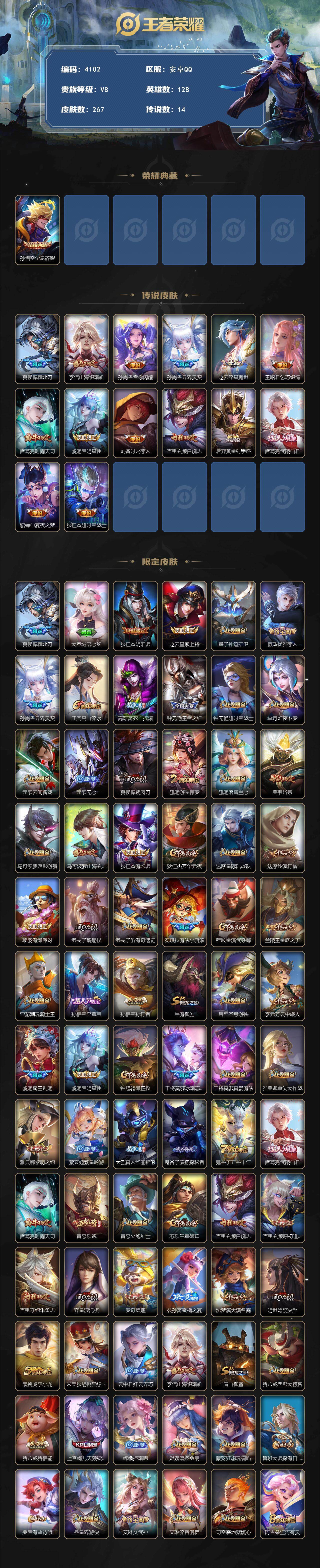 安卓Q-V8-尊贵铂金I段位-128英雄-267皮肤-1典藏皮肤-14传说-86史诗