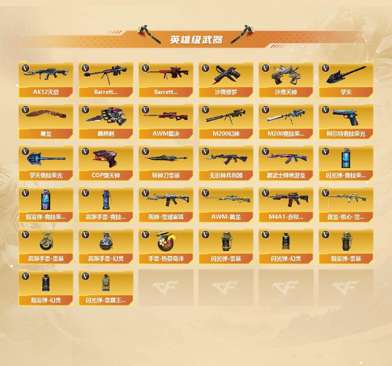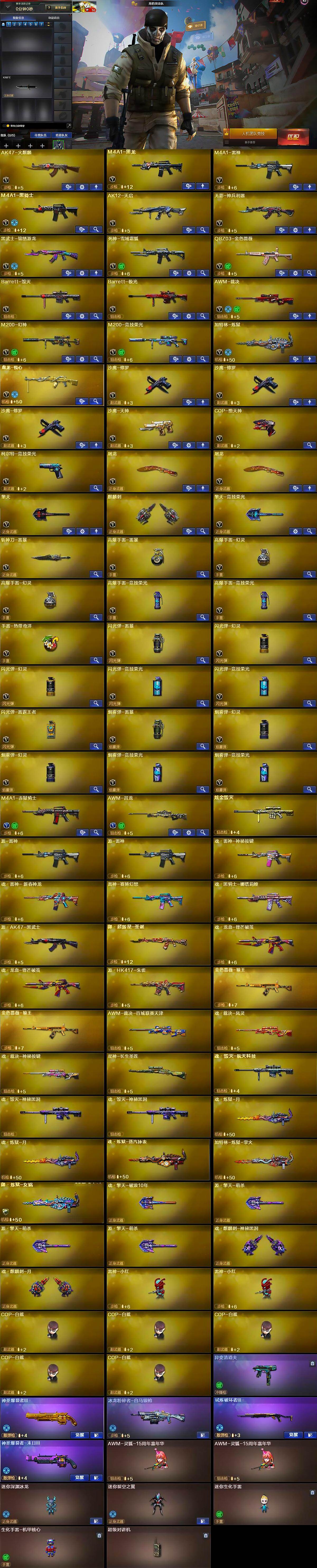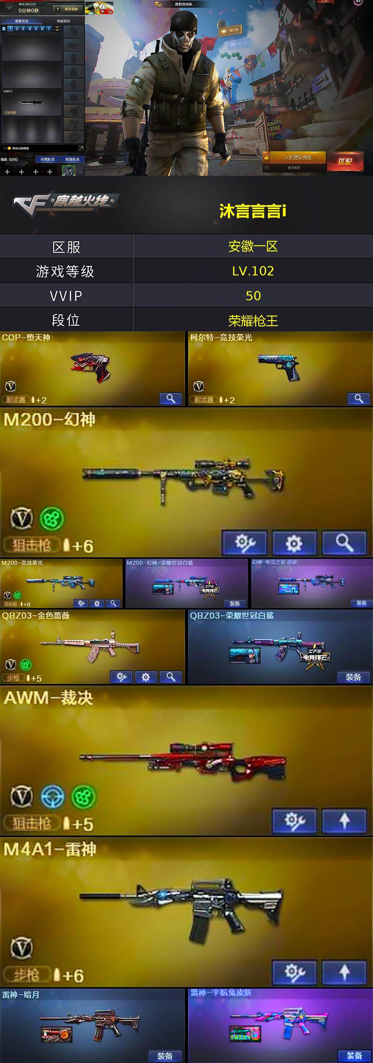 【热门武器】:QBZ03-金色蔷薇,M200-幻神,M200-竞技荣光,M4A1-黑骑士,加特林-炼狱,雷神-小红*2,COP-白鲨*5,COP-堕天神,沙鹰-修罗*3,黄金猫猫手套-白鲨
