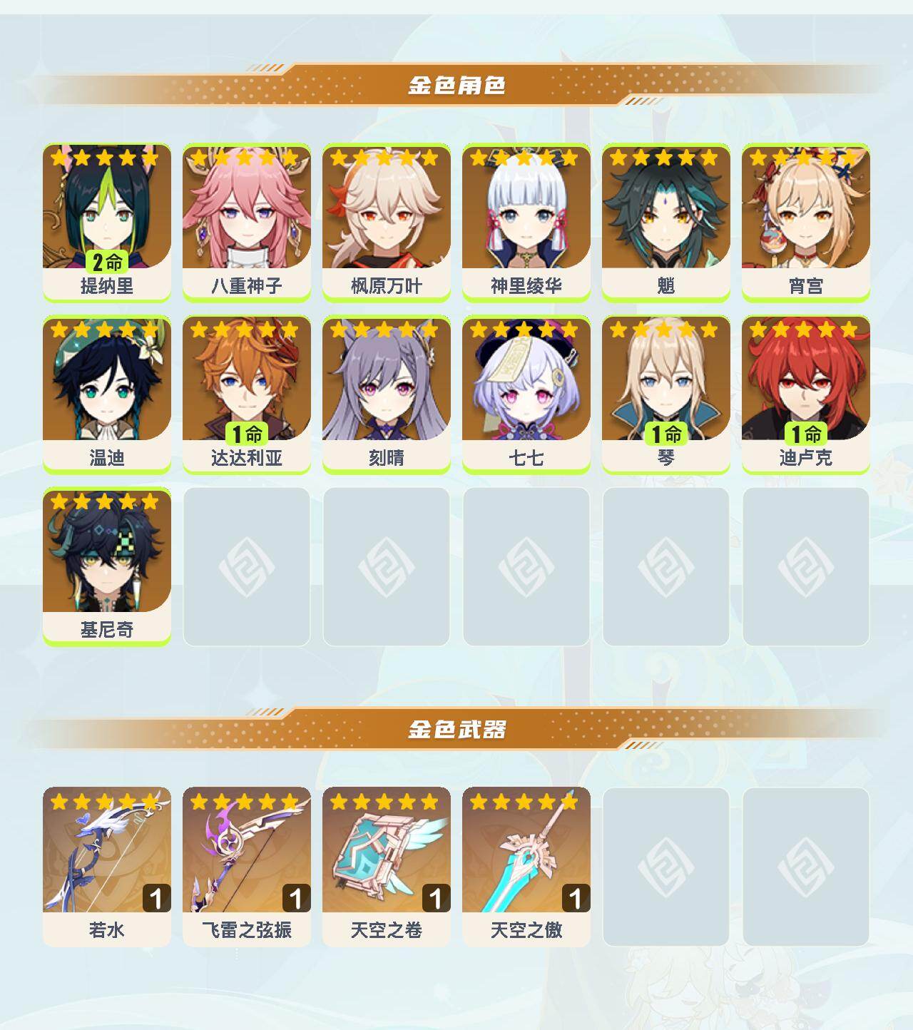 【YSN2257】57级/22黄/女主/13个五星角色/4个五星武器/1命达达利亚/枫原万叶/八重神子/魈/温迪/神里绫华/基尼奇/2命提纳里/宵宫/1命迪卢克/1命琴/刻晴/七七/飞雷之弦振/若水/天空之卷/天空之傲